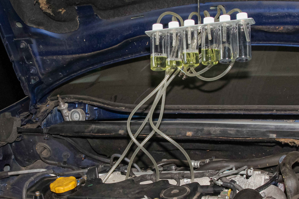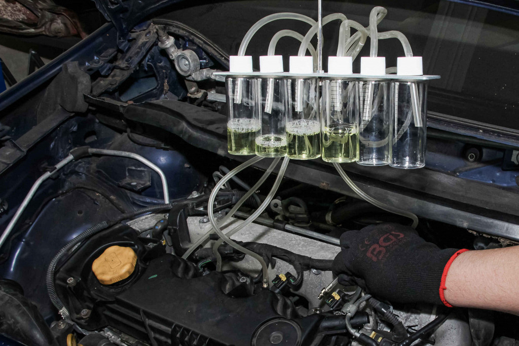 Komplet za merjenje povratnega toka injektorjev z merilnimi cevmi in steklenimi kozarci, primeren za večino znamk injektorjev.