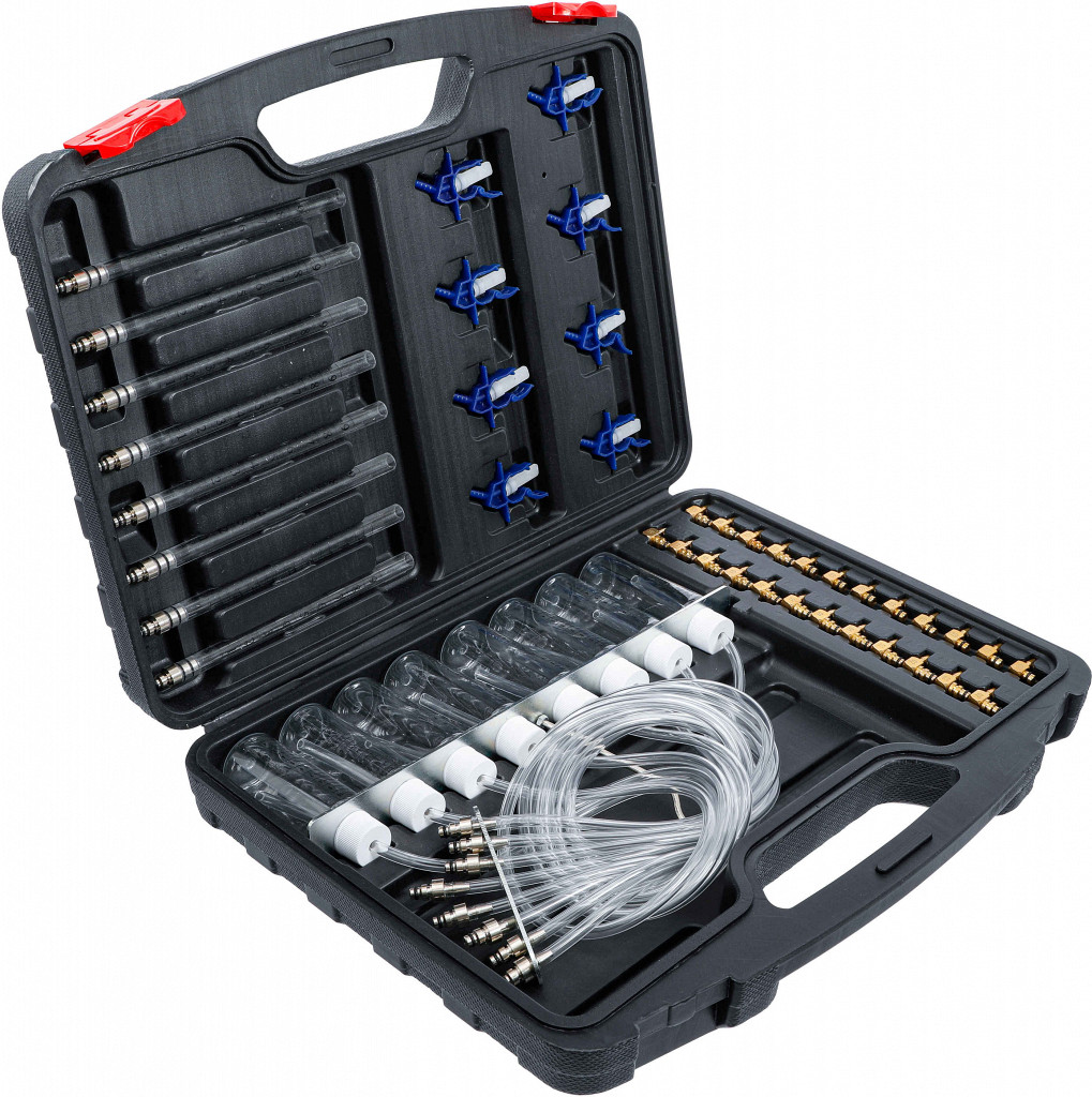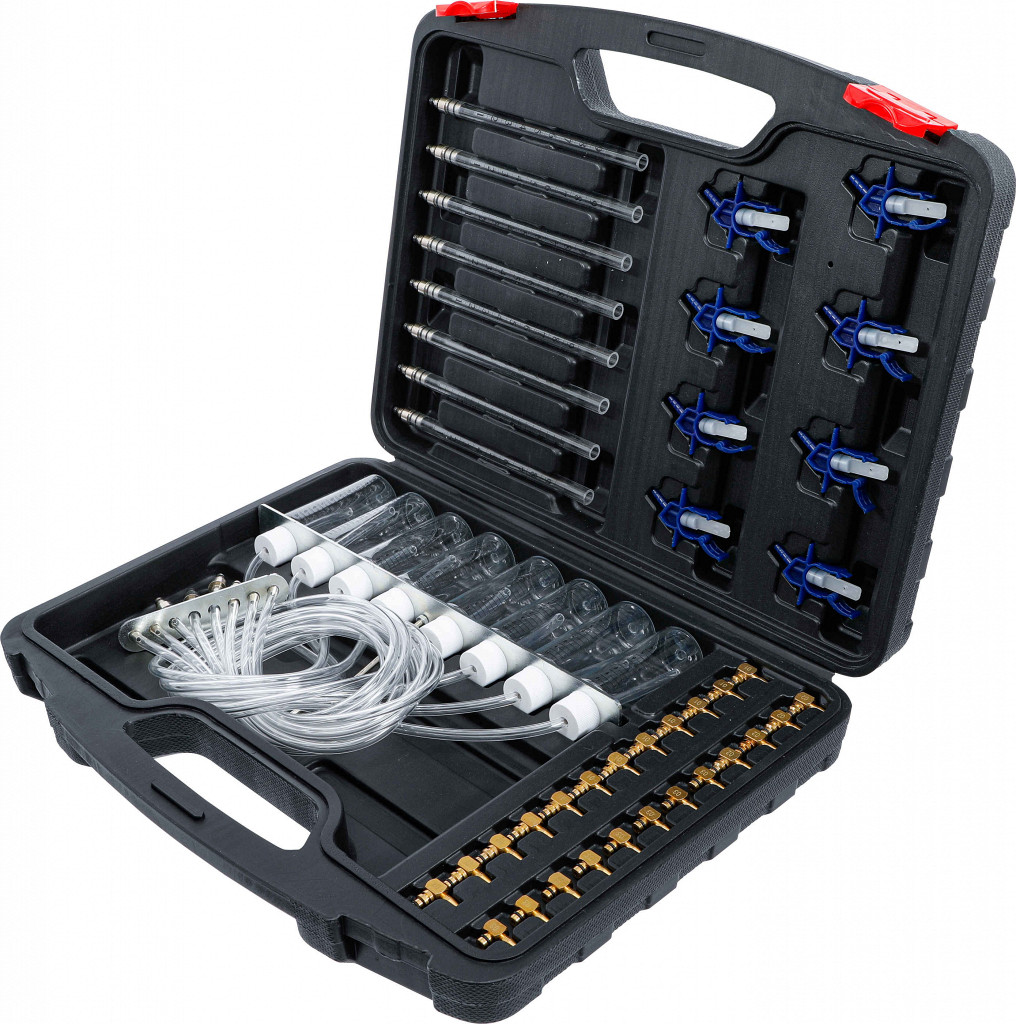 Prostornina povratnega toka se lahko določi s steklenimi cevmi ali merilnimi skodelicami za motorje Common Rail, do 8 injektorjev, primernih za različne znamke injektorjev. vključuje 8 steklenih cevi8 merilnih skodelic s priključno cevjo, nameščenih na aluminijasto palico s kavljem32 adapterji za:. Denso C3, C1Siemens C3DelphiBosch