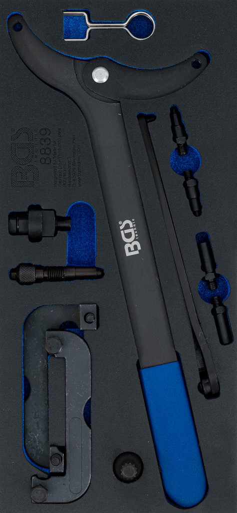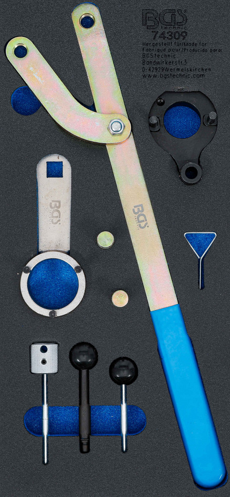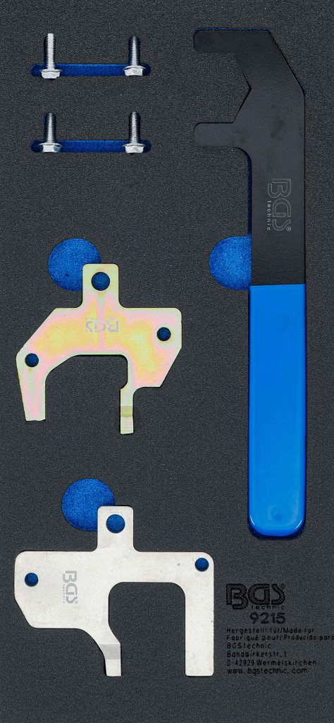 Komplet za preverjanje faz motorjev Opel 2.2 16V z verigo (Astra, Vectra, Signum, Zafira). Vključuje orodja za zaklep odmičnih in ročične gredi, napenjalca...