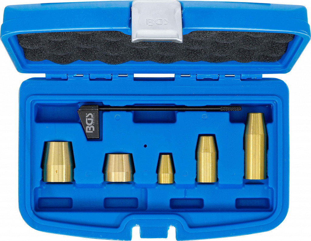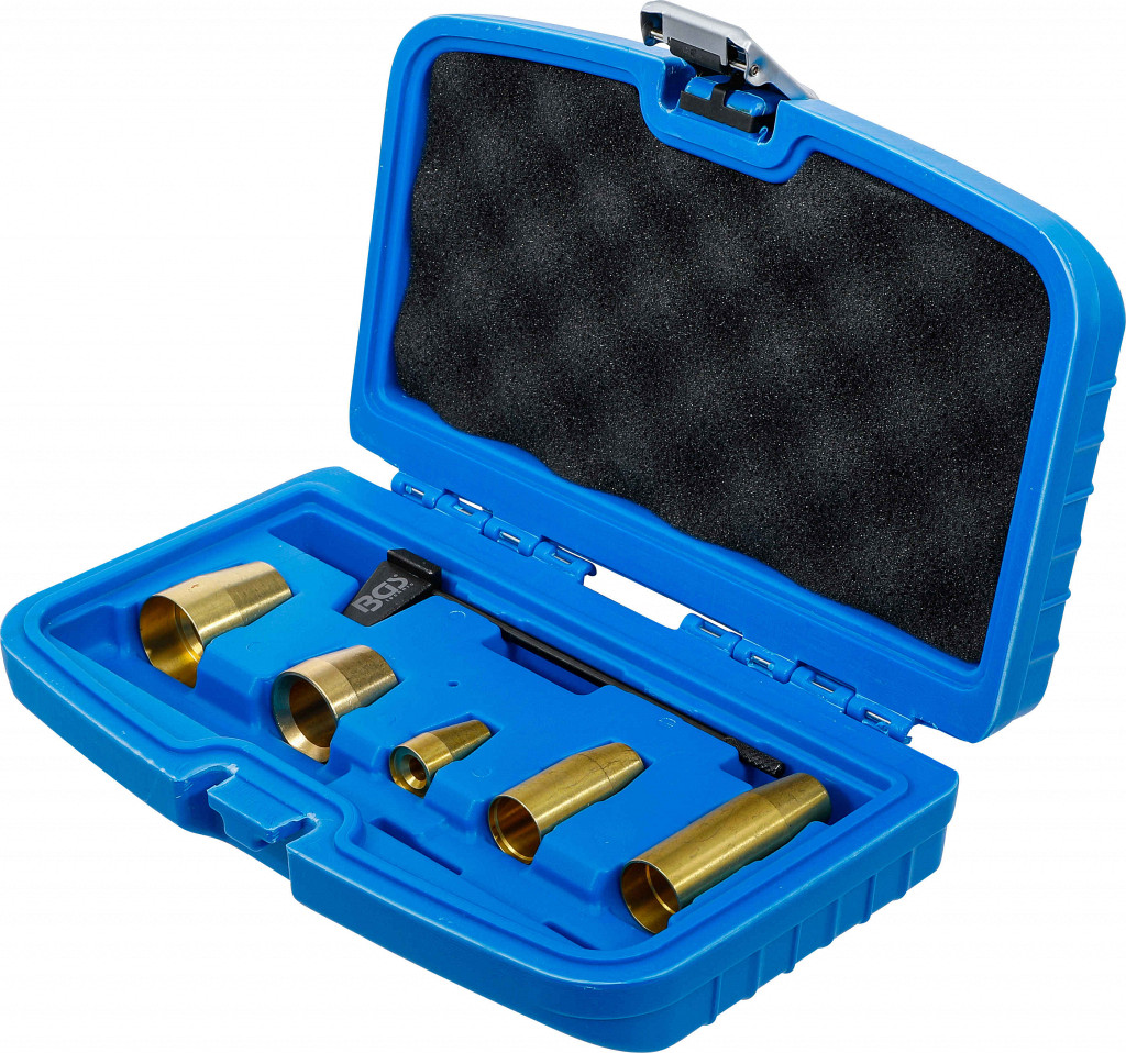 Set za natančno pozicioniranje enote črpalka–šoba in brezhibno montažo O-tesnil pri VAG motorjih. Primerno za VW in Audi 4-, 5- in 10-valjne motorje. Vsebina: merilo, več medeninastih tulcev za montažo O-tesnil.