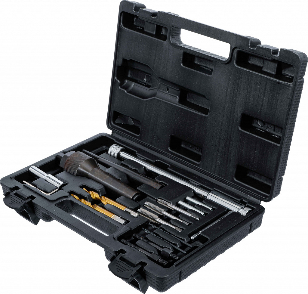 Za sestavljanje in demontažo vžigalnih svečk in strokovno popravilo navoja vžigalnih svečk. izvleček za zelo trdno nameščene vžigalne svečkestopni sveder za demontažo vžigalnih svečk 7 x 5,5 mm in 9 x 5,5 mm rezalniki navoja M8 x 1,0, M10 x 1,0 in 6,3 mm (1/4") - 28 UNF za ponovno rezanje vžigalne svečkedržalo navoja za navojno svečko s funkcijo zaskotkainsert E10