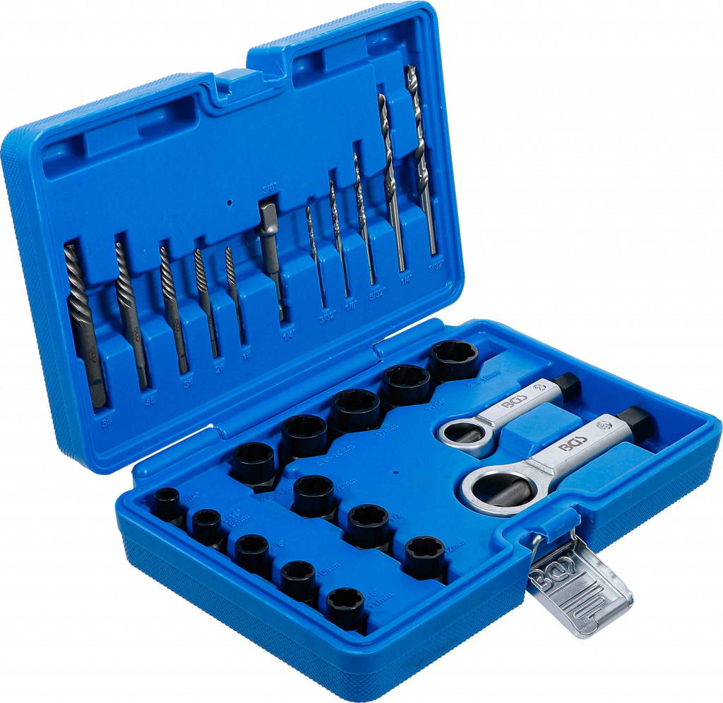 Kompaktna sestava orodij za ekstrakcijo za različne aplikacijeza odstranjevanje odtrganih vijakov, vijakov in matic z okvarjenimi pogonskimi glavamipritrdite ekstraktor na poškodovano glavo vijaka s preprostim predvrtanjem in enostavnim odstranjevanjemostri vijačni utori se bodo ugriznili v pritrjene ali okvarjene vijake, matice in vijake ter jih sprostili cepilnik matic za brizganje na tesne in preveč zategnjene matice, ne da bi poškodovali navojni vijak. . 8 vrtljivih vtičnic (spiralni profil) / izvleček vijakov | 10 mm (3/8"), 10 - 11 - 12 - 13 - 14 - 16 - 17 - 19 mm, krom molibdensko jeklo5 vrtljivih vtičnic (spiralni profil) / izvleček vijakov | 10 mm (3/8"), 1/4" - 5/16" - 1/2" - 3/8" - 11/16", krom molibdensko jeklo5 rotacijski vrtalniki, premer Ø 3/32" - 1/8" - 5/32" - 1/4" - 9/32", HSS 4341, desni rezal5 levi ekstraktorji, #1 - #2 - #3 - #4 - #5, kromirano molibdensko jeklo2 cepilniki matic, #2 - #3, 12 - 16 mm / 16 - 22 mm1 adapter za električni vrtalnik, 6,3 mm (1/4") pogon / 10 mm (3/8")