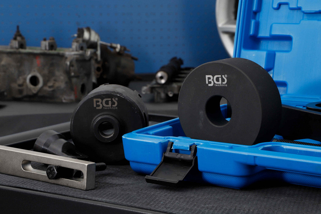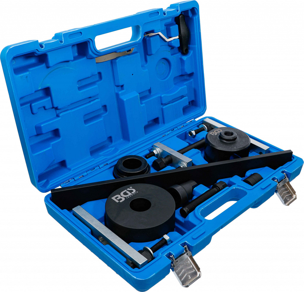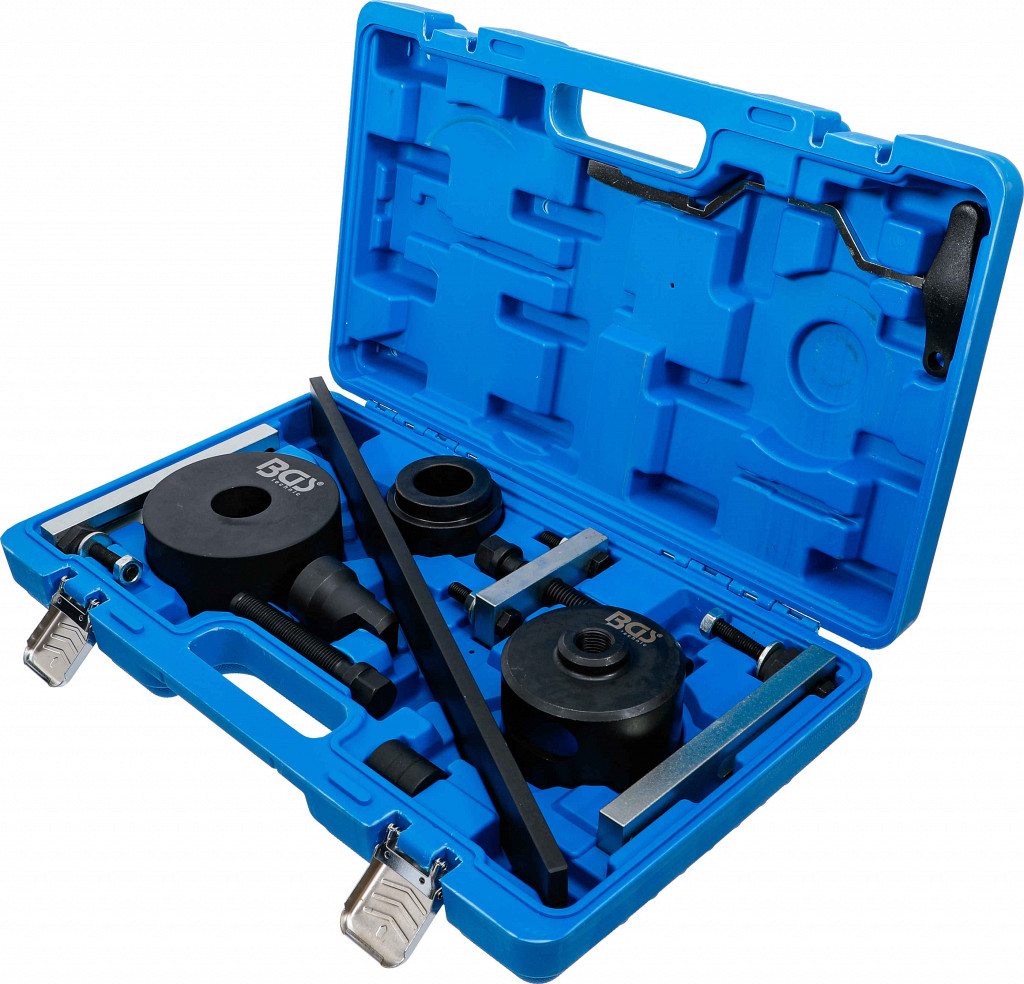 Komplet orodij za demontažo, montažo in nastavitev dvojne sklopke pri vozilih Audi in Volkswagen s 6- in 7-stopenjskimi menjalniki (kode 0AM, 08D, 0CW). Vključuje vzvod za montažo, podporni most z vretenom, potisni element, snemalec, ravnilo, merilne bloke in druge pripomočke (OEM T10407, T10323, T10376, T10373, T40100, T10374, T10466).