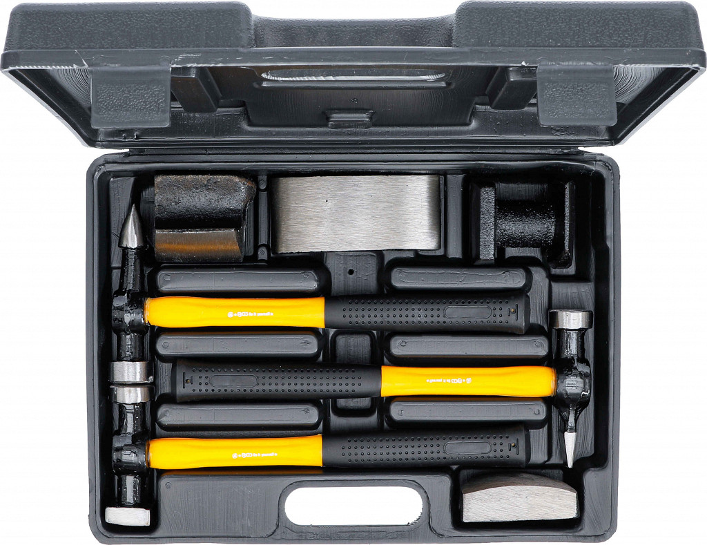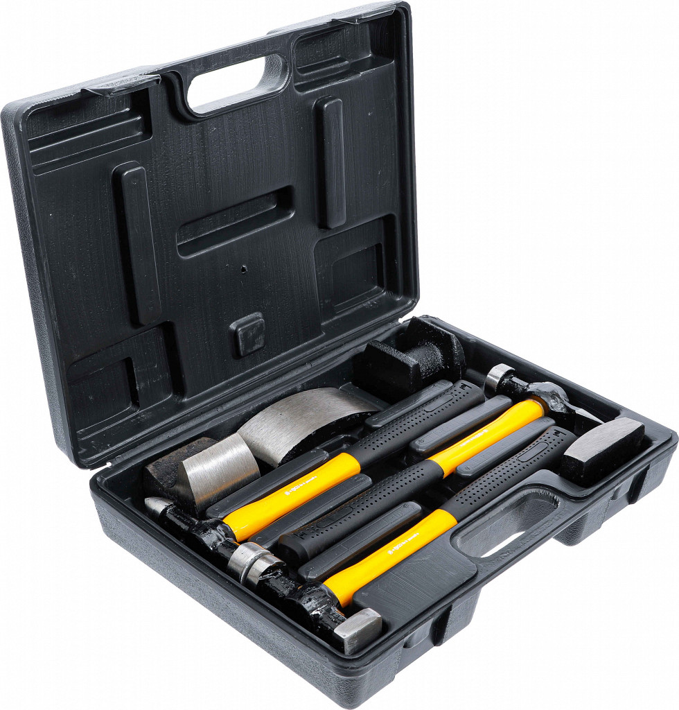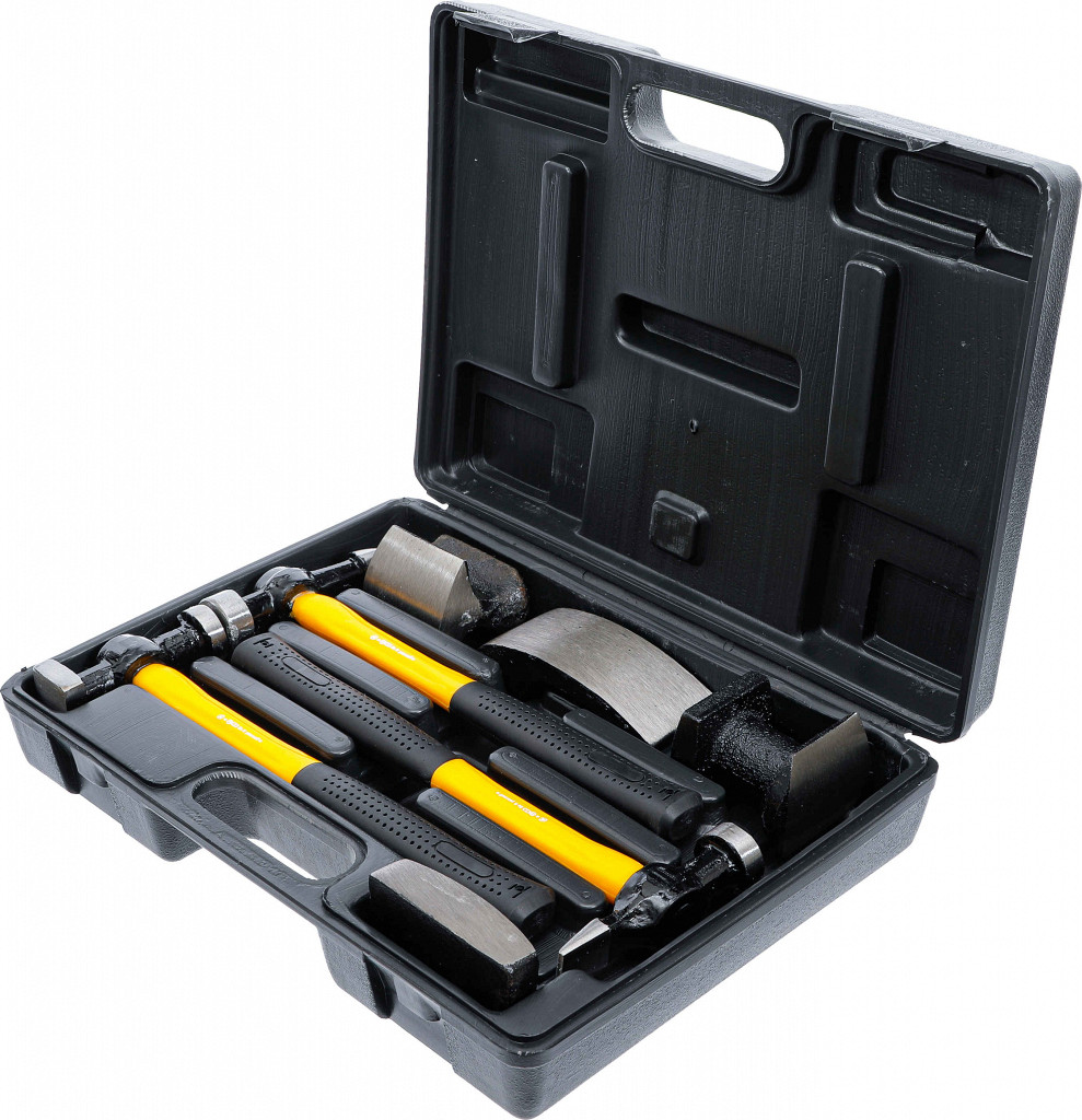 Za izbijanje karoserije vozila, priročna zasnova, za raztezanje in oblikovanje karoserijskih pločevin, v trpežnem plastičnem kovčku; vsebuje: 1 kleparski kladivce okrogla ravna glava / ozko koničasto rezilo, 1 kleparski kladivce okrogla ravna glava / kvadratna ravna glava, 1 kleparski kladivce okrogla ravna glava / ravno vodoravno rezilo, 1 ročno nakovalo klinasta oblika ukrivljeno, 1 ročno nakovalo z robom, 1 ročno nakovalo z majhnim radijem, 1 ročno nakovalo z velikim radijem.