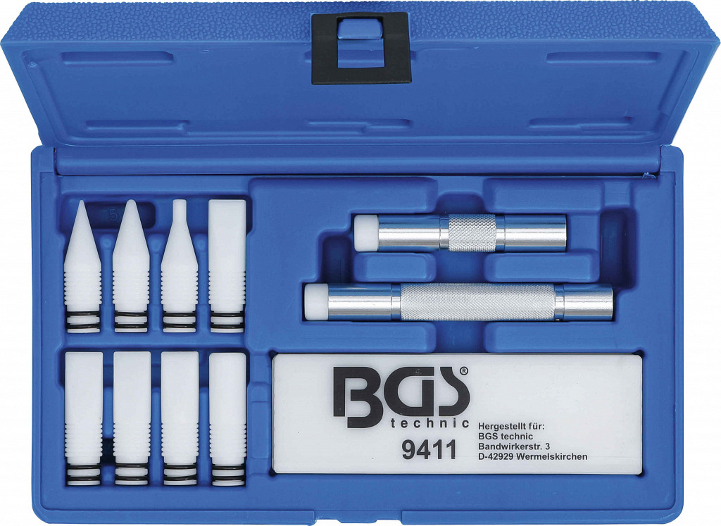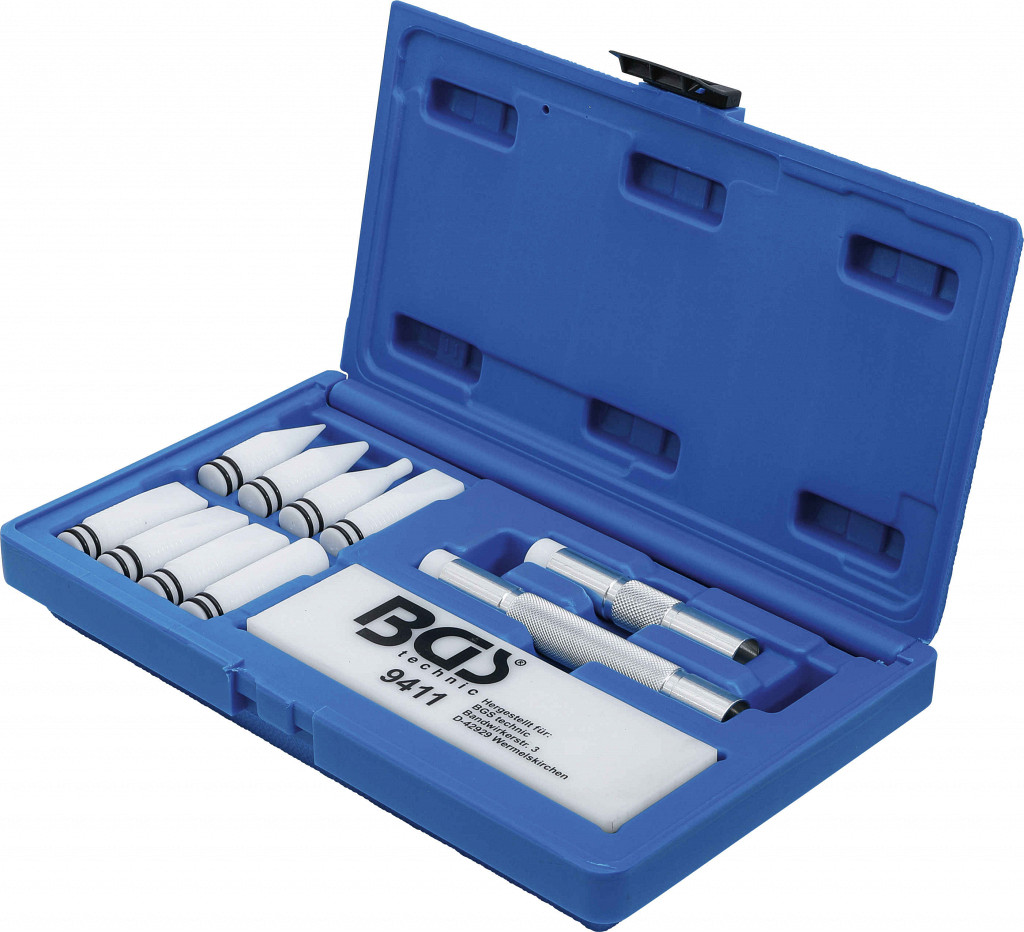 Komplet za izbijanje manjših udrtin (toča ipd.), z aluminijastimi ročaji in zamenljivimi nastavki različnih oblik (valjasti, klinasti, konični).