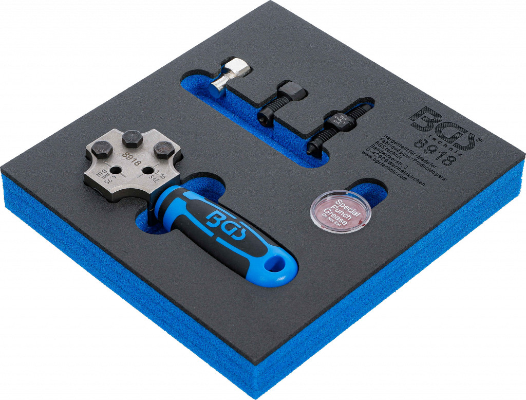 Orodje za hitro in enostavno raztezanje zavornih cevi 4,75 mm po SAE in DIN standardih, omogoča enojno ali dvojno raztezanje, možno tudi na vgrajenih ceveh, z dvo-komponentnim ročajem in mazivom.