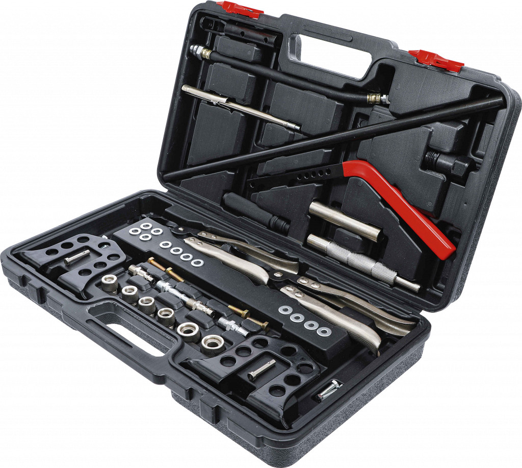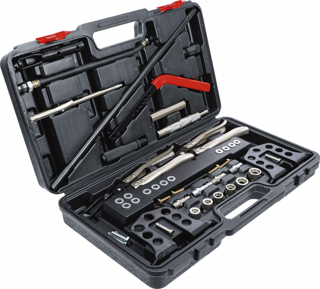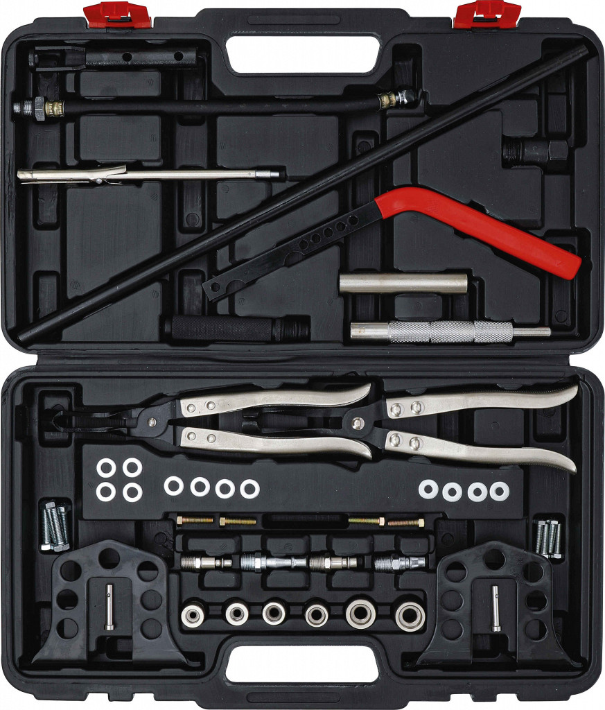 Set za demontažo in montažo ventilnih vzmeti ter tesnil ventilnih stebel brez odstranitve glave motorja. Vključen tlak z zrakom za cilinder (navoj M14/M18) in orodje za montažo klinov ventilov.