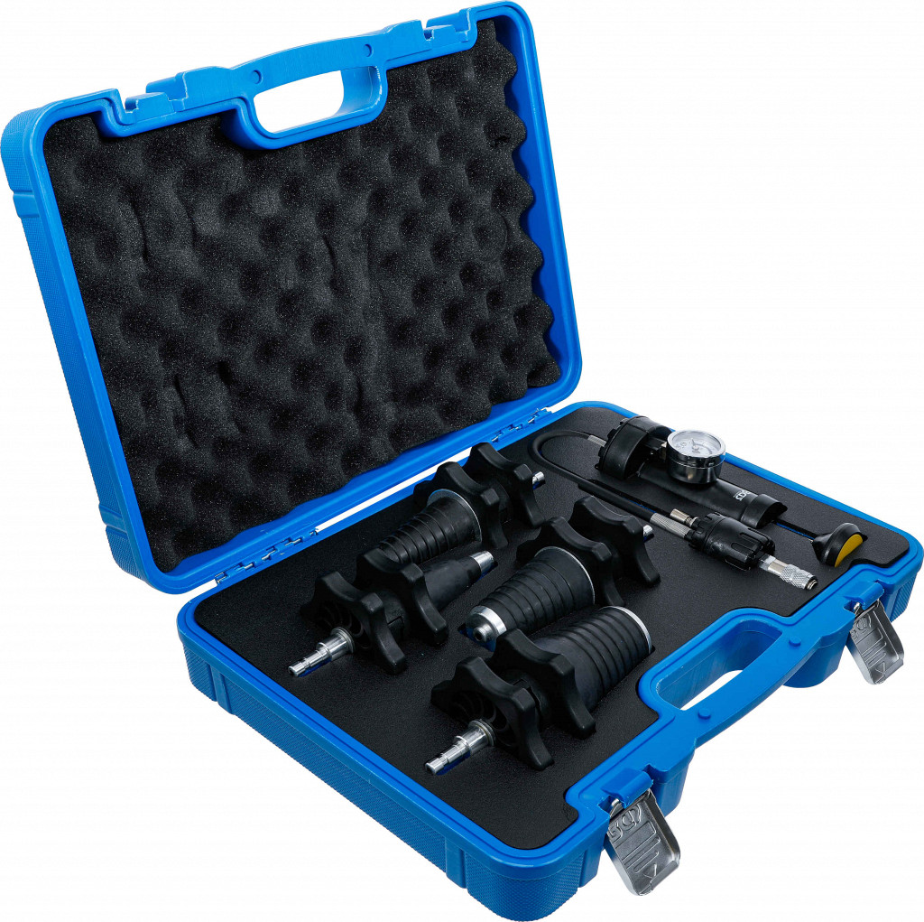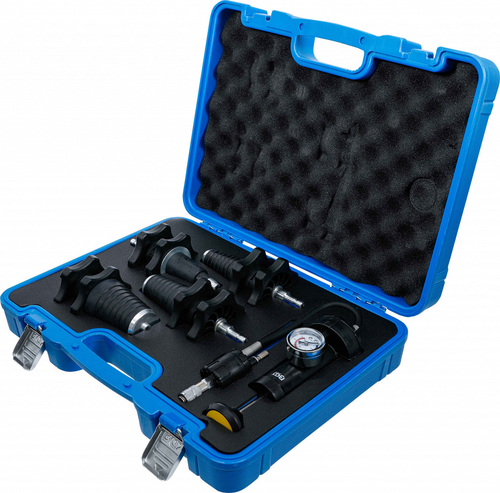 Tester tlaka hladilnih sistemov z raztegljivimi adapterji 17–48,5 mm, tlačna črpalka z manometrom do 2,4 bara in ventilom za sprostitev tlaka.