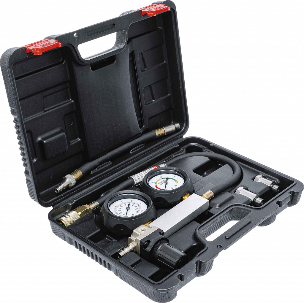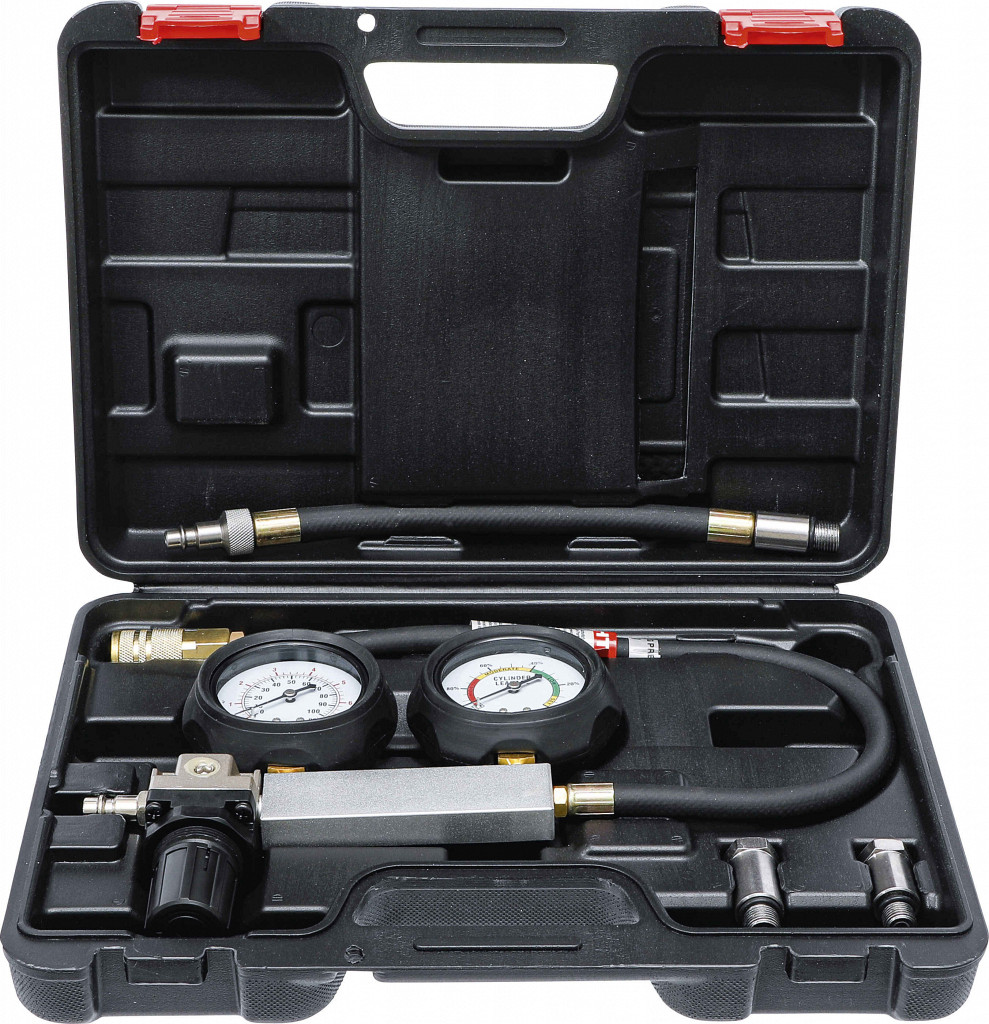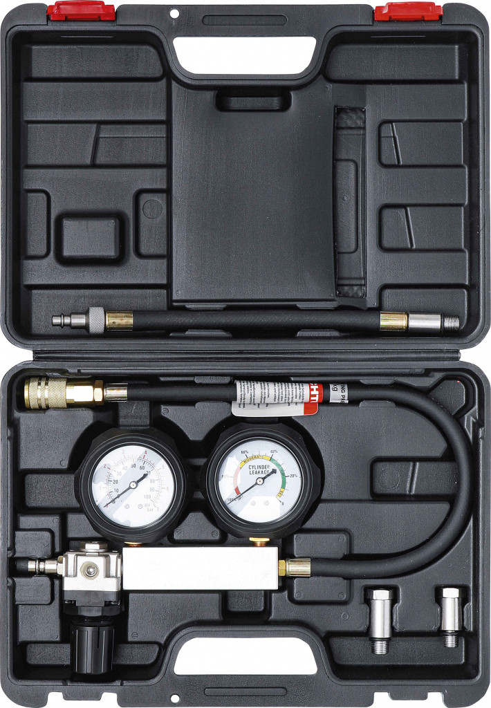 Tester puščanja zgorevalne komore za hitro diagnostiko tesnila glave, ventilov ali batnih obročkov. Prikazuje padec tlaka v %, omogoča tudi akustični test. Primeren za motorje z navoji M12 x 1,25 in M14 x 1,25. Vsebina: adapterja M12 in M14, cev s hitrim spojem, merilna enota z regulatorjem zraka in kazalnikoma.