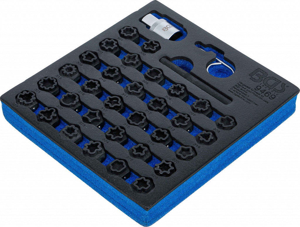 Komplet za montažo in demontažo varnostnih vijakov platišč Mercedes-Benz v penastem vložku.