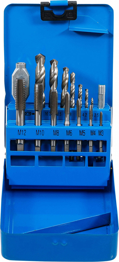 Za rezanje notranjih metričnih navojev, v kovčku. Vsebina: navojni svedri M3 x 0,5 - M4 x 0,7 - M5 x 0,8 - M6 x 1,0 - M8 x 1,25 - M10 x 1,5 - M12 x 1,75 in 7...