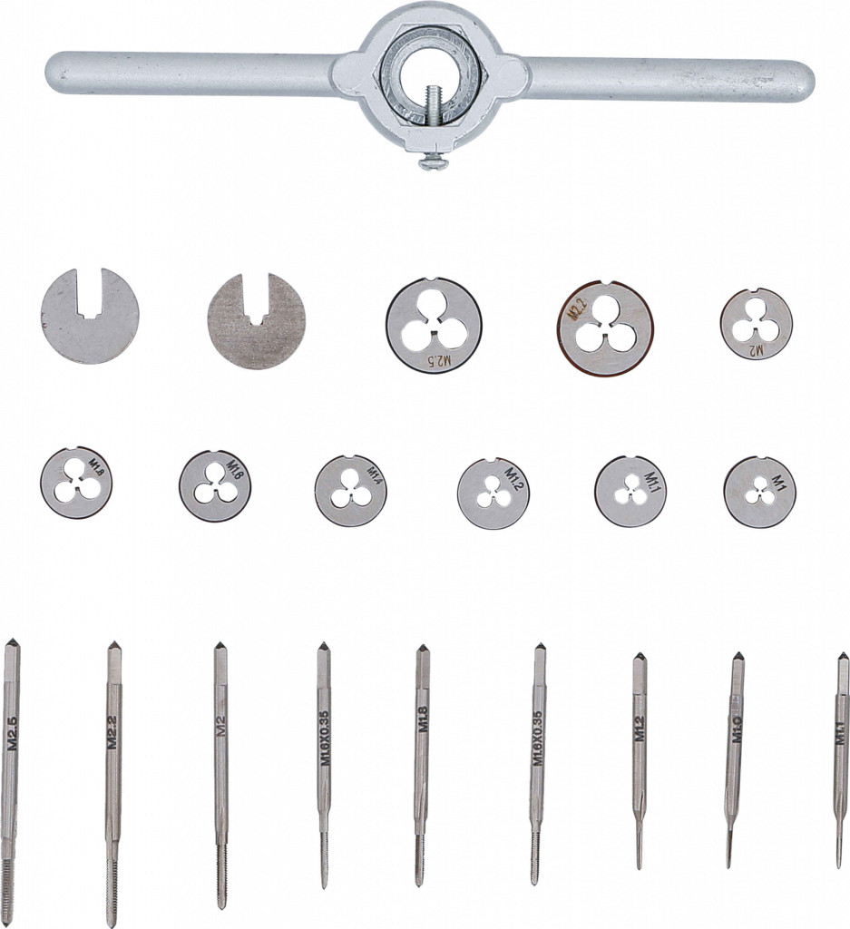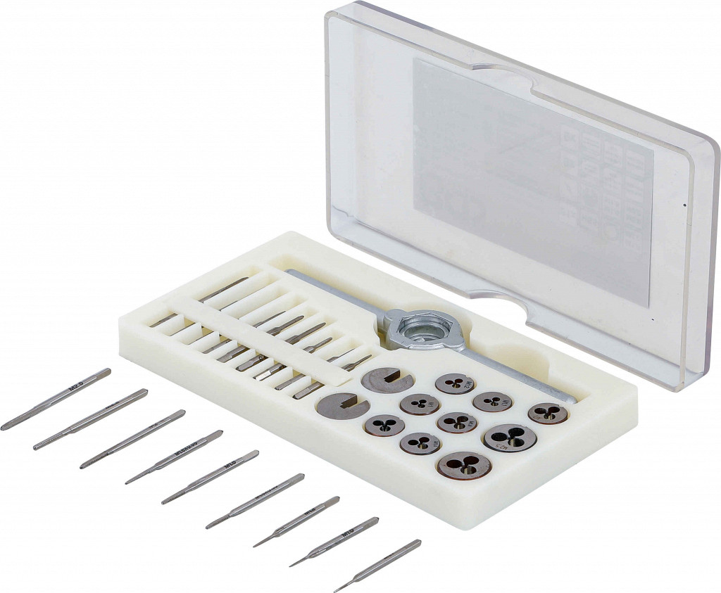 Vsebuje posebej majhne velikosti navojnih svedrov, primerno za precizno mehaniko, elektroniko, urarstvo in modelarstvo, vključuje 18 svedrov (začetni in vmesni), redukcijske obroče, nosilec in navoje.