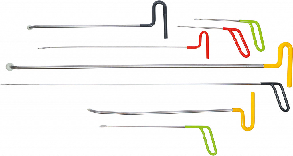 Za odstranjevanje udrtin na karoseriji brez poškodbe laka, idealno za manjše udrtine in poškodbe od toče, iz nerjavečega jekla, različne glave, v priročnem kovčku. Vsebina: 2 polokrogli palici 210 / 220 mm, 1 okrogla palica 420 mm, 1 polokrogla koničasta palica 600 mm, 2 ukrivljeni palici s kroglično glavo 460 / 1000 mm, plastična glava z navojem M5 x 0.81, 1 koničasta palica 500 mm, 1 posebna ukrivljena palica 1070 mm.