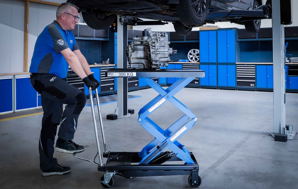 Za dvigovanje in transport predmetov kot so motorji, menjalniki itd., gladko delujoč hidravlični nožni pedalni sistem, posamično nastavljiva višina, omogoča enostavno dvigovanje težkih predmetov na delovno višino, omogoča ergonomsko in lahkotno delo, robustna dvojna škarjasta jeklena konstrukcija, 4 močna kolesa s krogličnimi ležaji (2 vrtljiva z zavoro), z ročajem za lažje manevriranje, vključuje gumijasto podlogo za platformo. Dimenzije platforme: 500 x 912 mm.