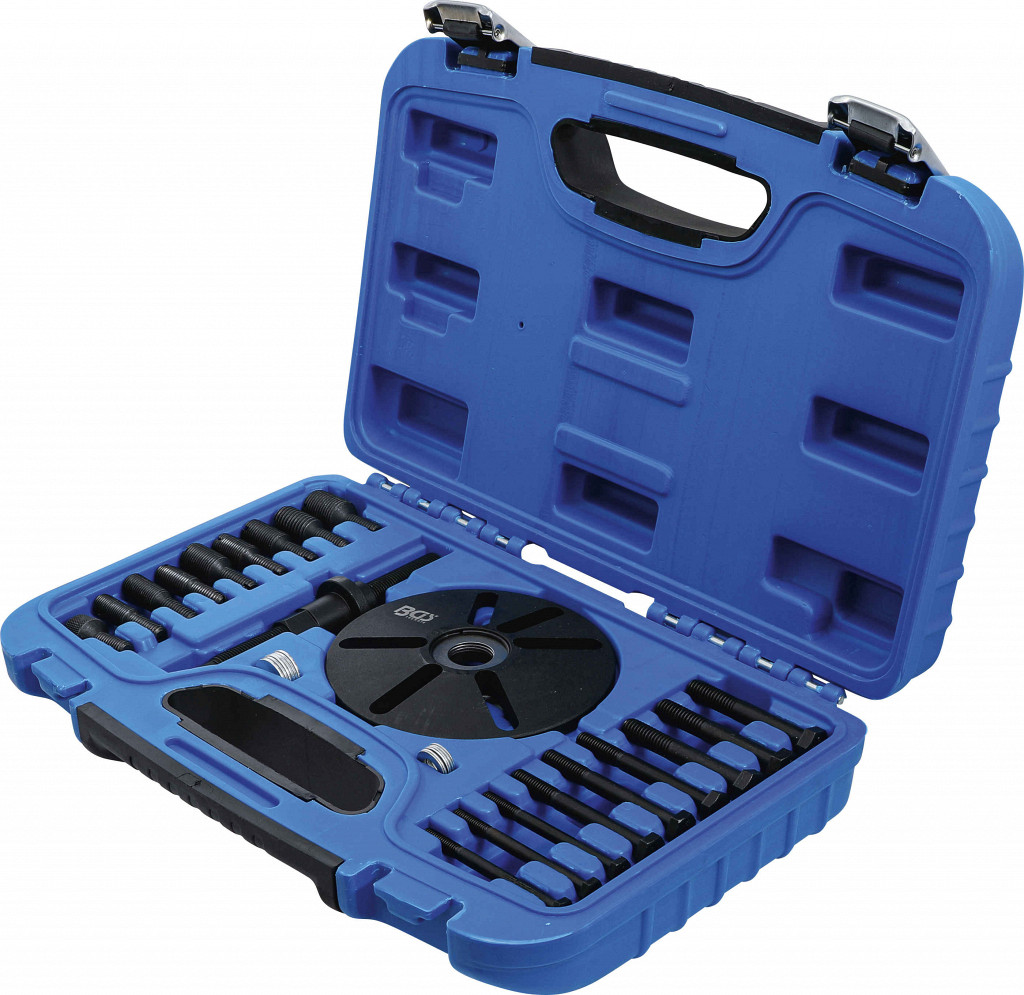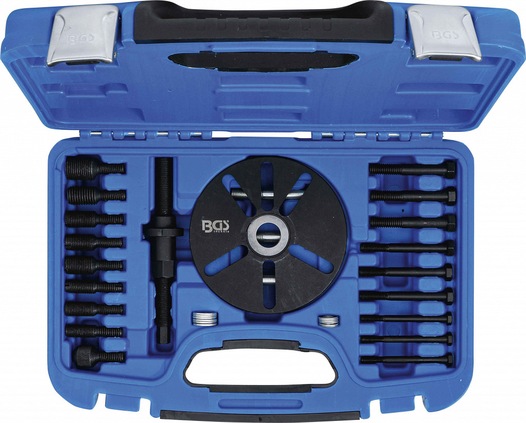 Univerzalni snemalni set za balansirne in ročične gredi, vključno s snemalno ploščo, vijaki, osrednjim vijakom in 9 adapterji z različnimi navoji (metričnimi in colskimi).
