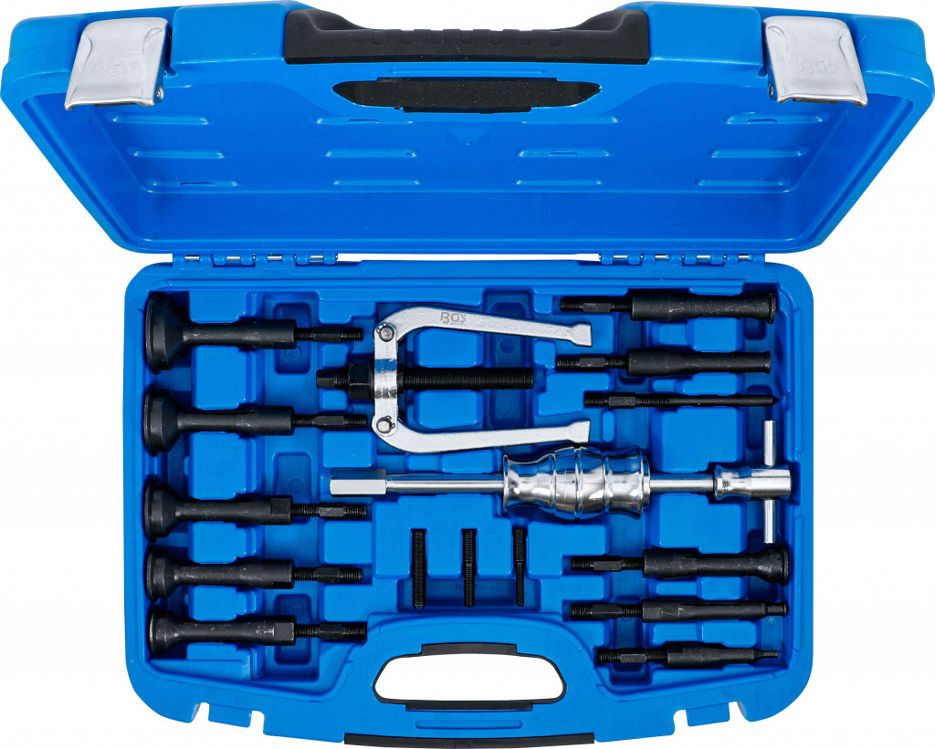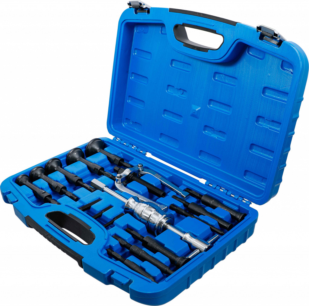 Komplet za demontažo ležajev iz slepih lukenj, priloženo drsno kladivo 900 g, snemalec z vretenom 125 mm, ter čeljusti v razponu 5–52 mm.