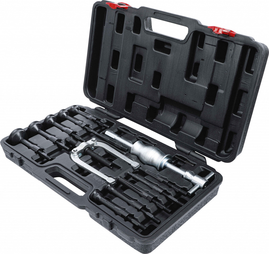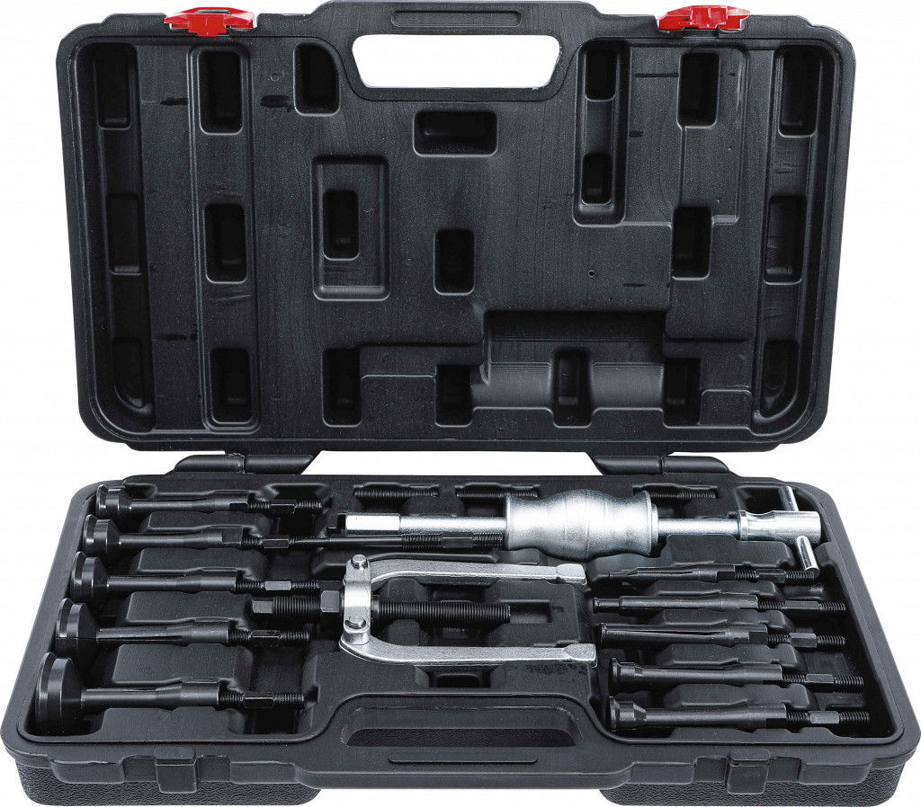 Komplet za demontažo ležajev v slepih luknjah, primeren za menjalnike, vsebuje snemalno kladivo, dvokraki snemalec s vretenom in raztezne čeljusti za ležaje...