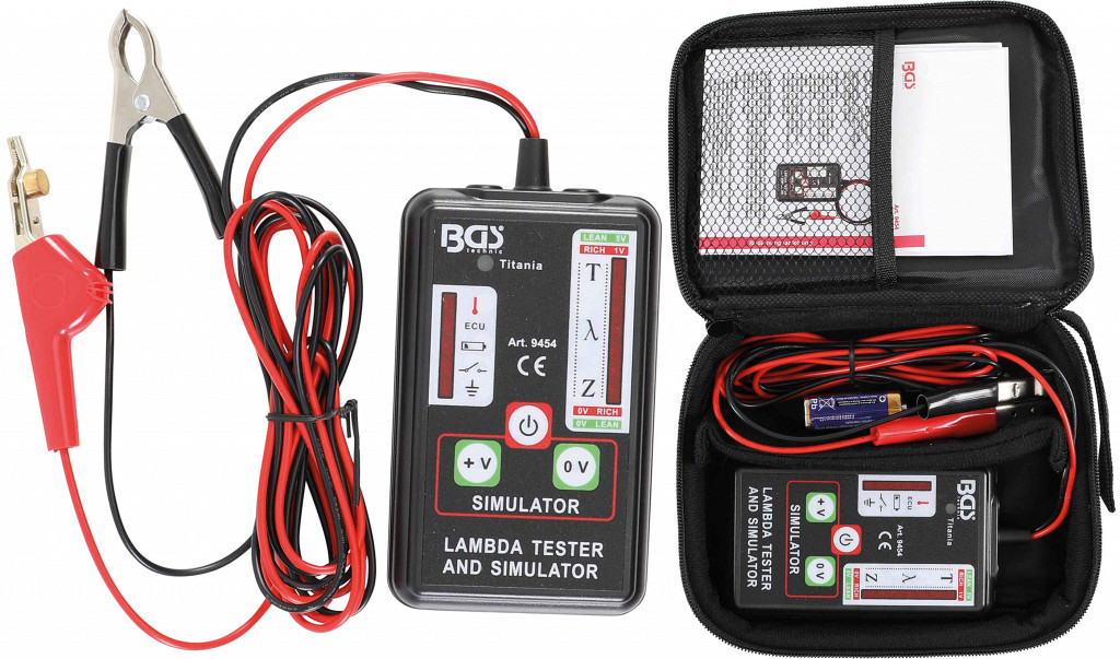 Tester za ogrevane in neogrevane lambda sonde z 1 do 4 kabli. LED prikazuje signal sonde, omogoča simulacijo bogate ali revne mešanice za preverjanje odziva ECU. Primeren za cirkonijeve in titanove sonde. Vključen 9V akumulator, robustno ABS ohišje, enostavna priključitev s sponko.