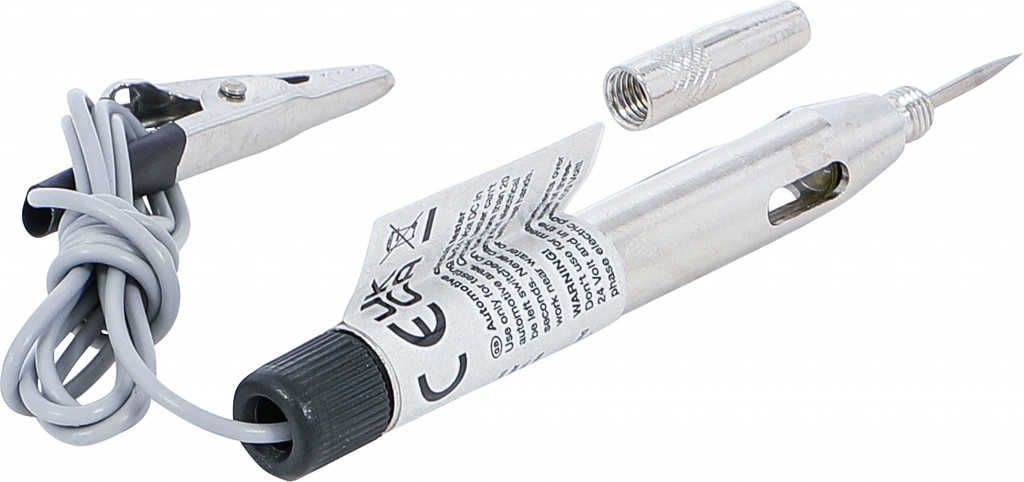 Za iskanje kratkih stikov in prekinitev, testna konica zaščitena z navojnim pokrovčkom, s krokodilsko sponko, sonda iz nerjavečega jekla, ohišje in pokrovček iz medenine