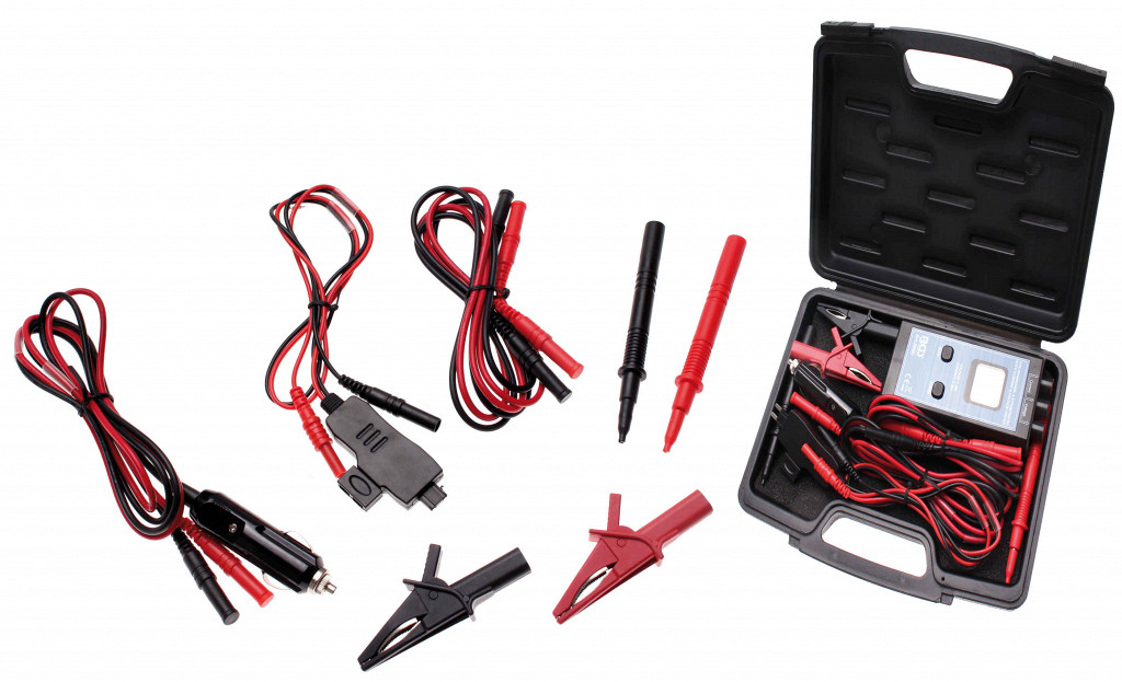 Merilna naprava za diagnostiko električnih tokokrogov v vozilih. Hitro in varno meri tok (do 30 A) in napetost (1–48 V). Deluje neposredno v ležišču varovalke. Vsebina: merilna naprava, krokodilke, kabli za meritve, adapterji in sonde. Napajanje: 9 V baterija.