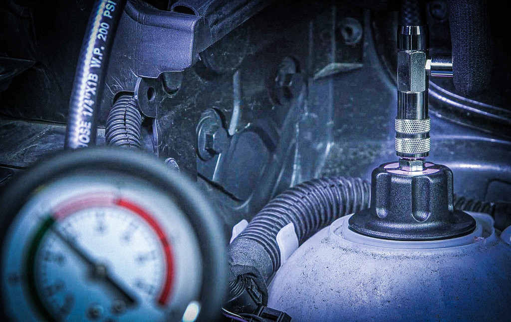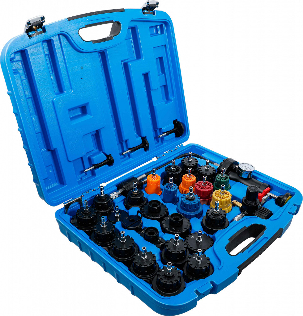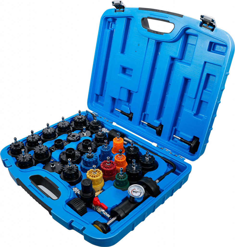 Komplet za odkrivanje puščanja v hladilnem sistemu, primeren za večino vozil. Merilno območje ročne tlačilke 0–2,5 bara (0–35 psi), regulatorja tlaka 0–5 barov (0–70 psi). Vsebina: ročna tlačilka s cevjo in hitrim spojem, tlačni regulator z varnostnim ventilom, več adapterjev za Mercedes-Benz, Audi, Opel, Ford, BMW, Volvo, Citroen, Fiat, Renault, Peugeot, VW, Honda, Toyota, Mitsubishi, Nissan, Mazda in univerzalni adapterji.