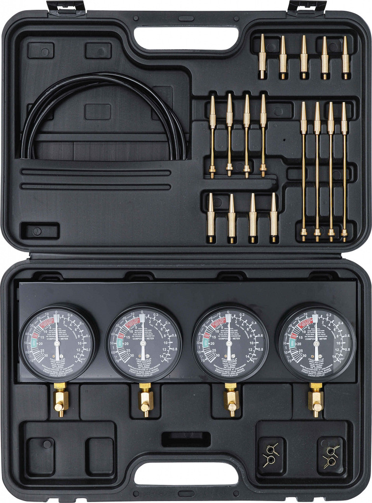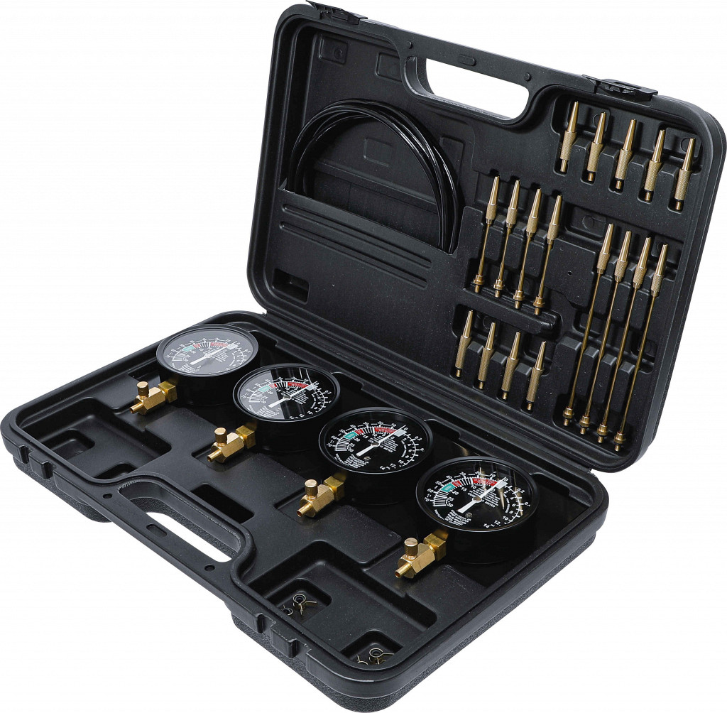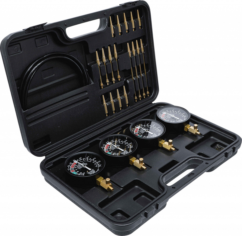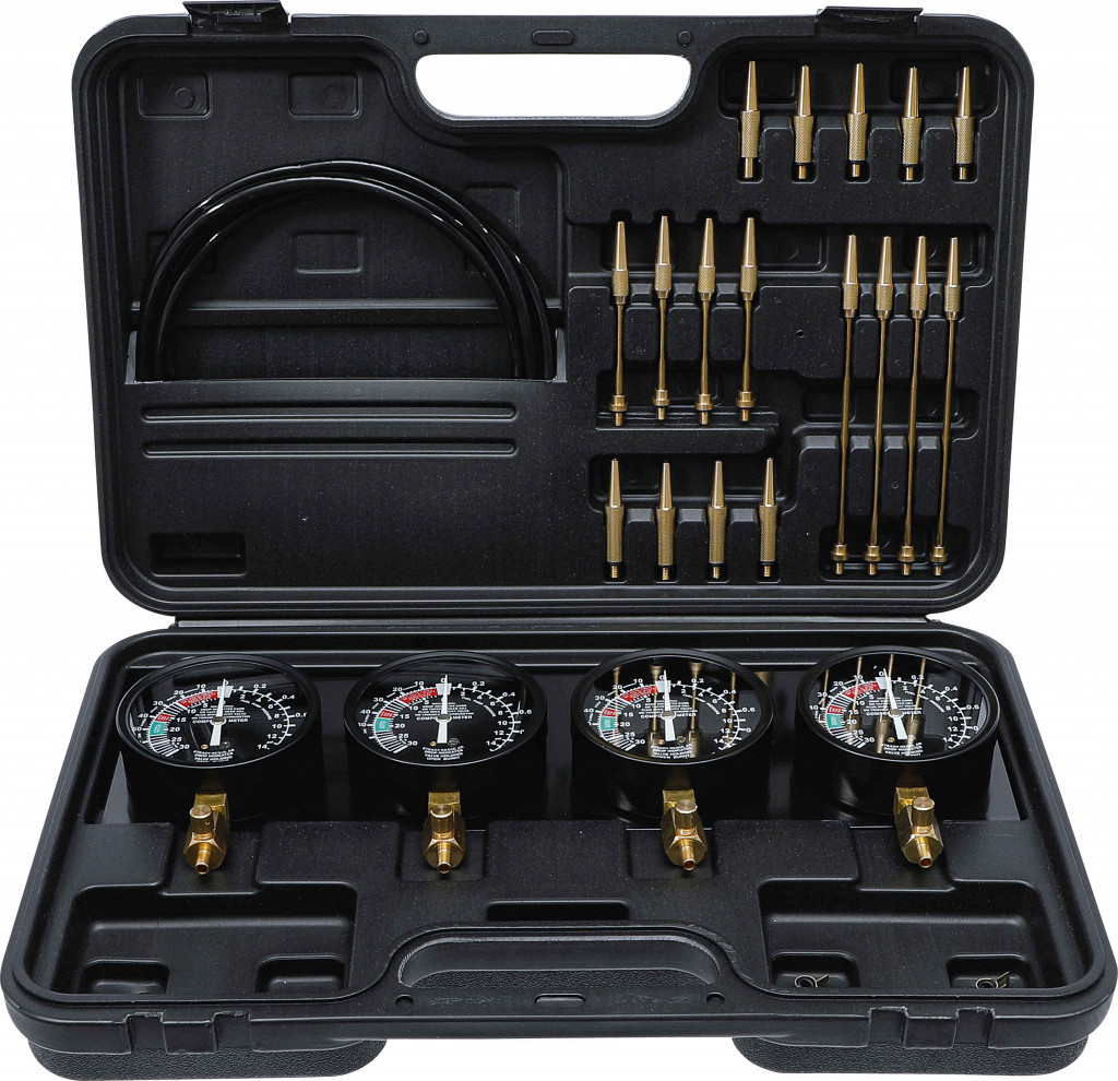 Za sinhronizacijo 2-, 3- in 4-uplinjačnih sistemovprimerni avtomobili in motorna kolesa. Obseg dobave: 4 merilniki tlaka Ø 92,5 mm, nameščeni na plošči4 gumijaste cevi 8 x 5 x 750 mm4 zamenjava tesnil za cevno objemko4 priključki 53 mm (M6 x 0,75)4 priključki 60 mm (M6 x 1,00)4 podaljški 3,9 x 102 mm4 podaljški 3,9 x 170 mm območje merjenja negativnega tlaka: 0 do -70 cm Hg (0 do -30 In Hg)območje merjenja tlaka: 0 do 14 PSI (0 do 1 kg/cm²)
