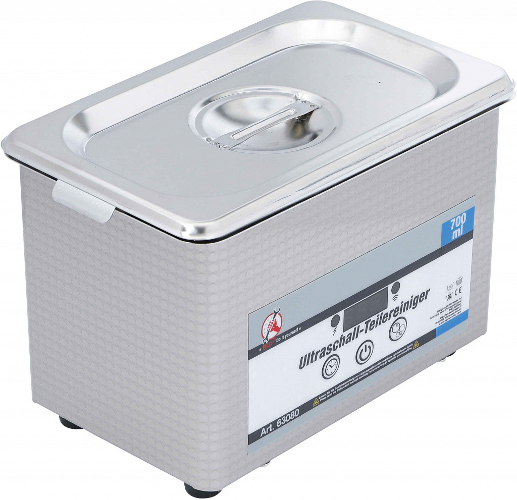 Ultrazvočna čistilna naprava za čiščenje delov uplinjačev, nakita, pasov ur, kovancev in zbirateljskih predmetov, učinkovito odstranjuje umazanijo, ohišje, posoda in pokrov iz nerjavečega jekla, prostornina posode 0,7 l, velikost posode 154 x 88 x 65 mm, moč ultrazvoka 35 W, nastavitev časa 0–30 min (18 stopenj), frekvenca ultrazvoka 42 kHz.