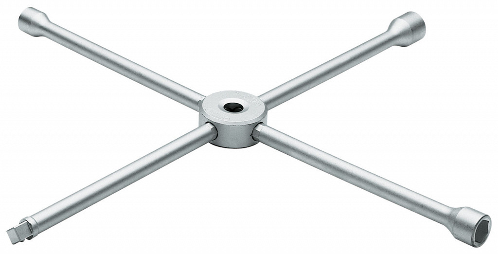 Po standardu DIN 3119, ISO 6788. Z močno ojačitvijo križanja, za servise avtomobilov in tovornjakov. Z podaljšanimi ročicami in široko paleto nasadnih ključev. GEDORE vanadijevo jeklo 31CrV3, kromirani. Dimenzije: 550 x 550 mm.