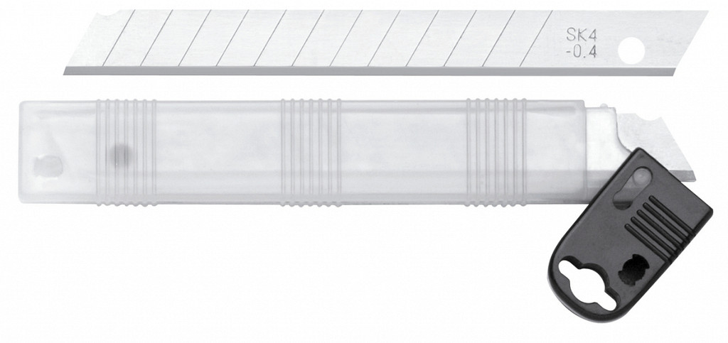 Rezilo širine 9 mm. Plastično ohišje. Kovinsko vodilo rezila. Upravljanje z eno roko. Za desničarje. Priloženo 5 rezervnih rezil (dolžina 80 mm, debelina 0,4...