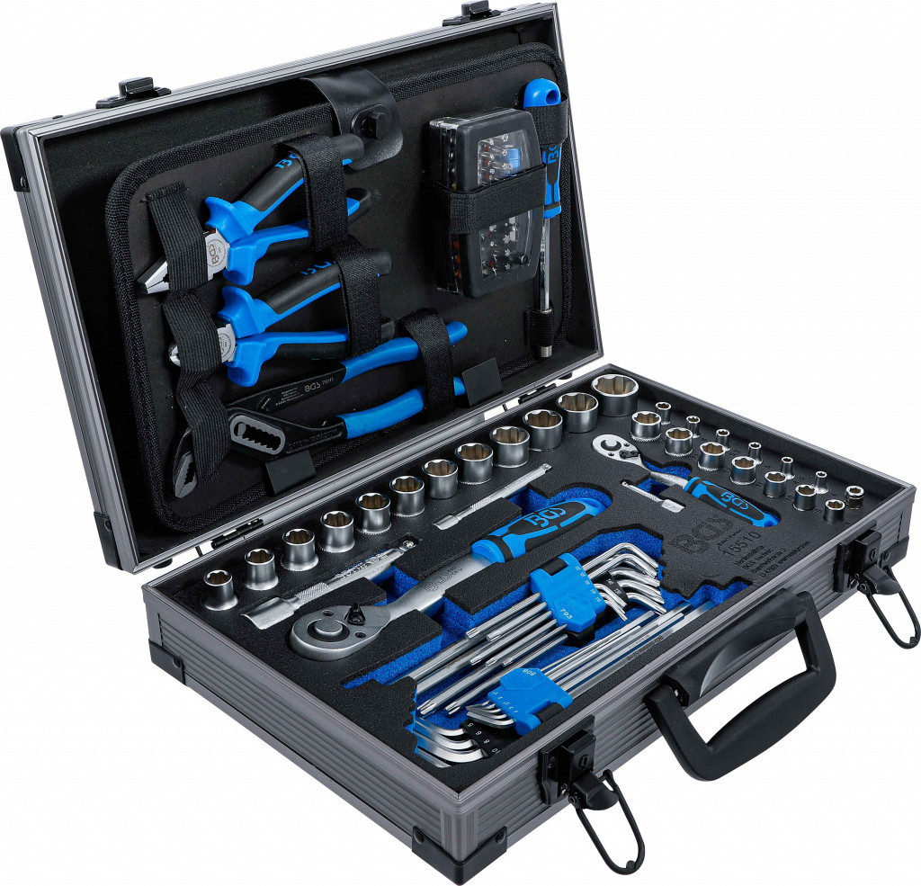 Osnovni set orodja za zahtevne mehanike in domače mojstre. Vsebuje 85 delov in je primeren za številne naloge. Vzdržljiv kovček iz aluminija z ojačanimi robovi ščiti vsebino. Med transportom so vsi deli varno pritrjeni z elastičnimi trakovi in ježki. Plošča iz MDF plošče, odporne na umazanijo. V spodnjem delu je EPE pena iz trdega kakovostnega materiala, ki drži vsak kos na mestu. Nasadni ključi, podaljški, raglje in klešče iz krom-vanadijevega jekla s satenasto kromirano površino. L-ključ in nastavki iz kakovostnega S2 krom-vanadijevega jekla, barvno označeni. Obseg dobave: kombinirane klešče 165 mm (BGS 369), švedske diagonalne klešče 165 mm (BGS 393), vodne klešče 240 mm (BGS 75111), barvni set nastavkov 32-delni (BGS 4816), raglja 12,5 mm (1/2") (BGS 620), gibljiv podaljšek 125 mm (BGS 234), nasadni ključi super lock 12,5 mm (1/2") 10–24 mm (BGS 2410–2424), raglja 6,3 mm (1/4") (BGS 618), ročaj za nastavke 200 mm (BGS 217), gibljivi podaljški 50 mm in 100 mm (BGS 2231–2232), nasadni ključi super lock 6,3 mm (1/4") 4–14 mm (BGS 2344–2354), adapter za nastavke 6,3 mm (BGS 8213), set dolgih L-ključev Torx T10–T50 (BGS 793), set dolgih L-ključev notranji šesterokotni 1,5–10 mm (BGS 808).