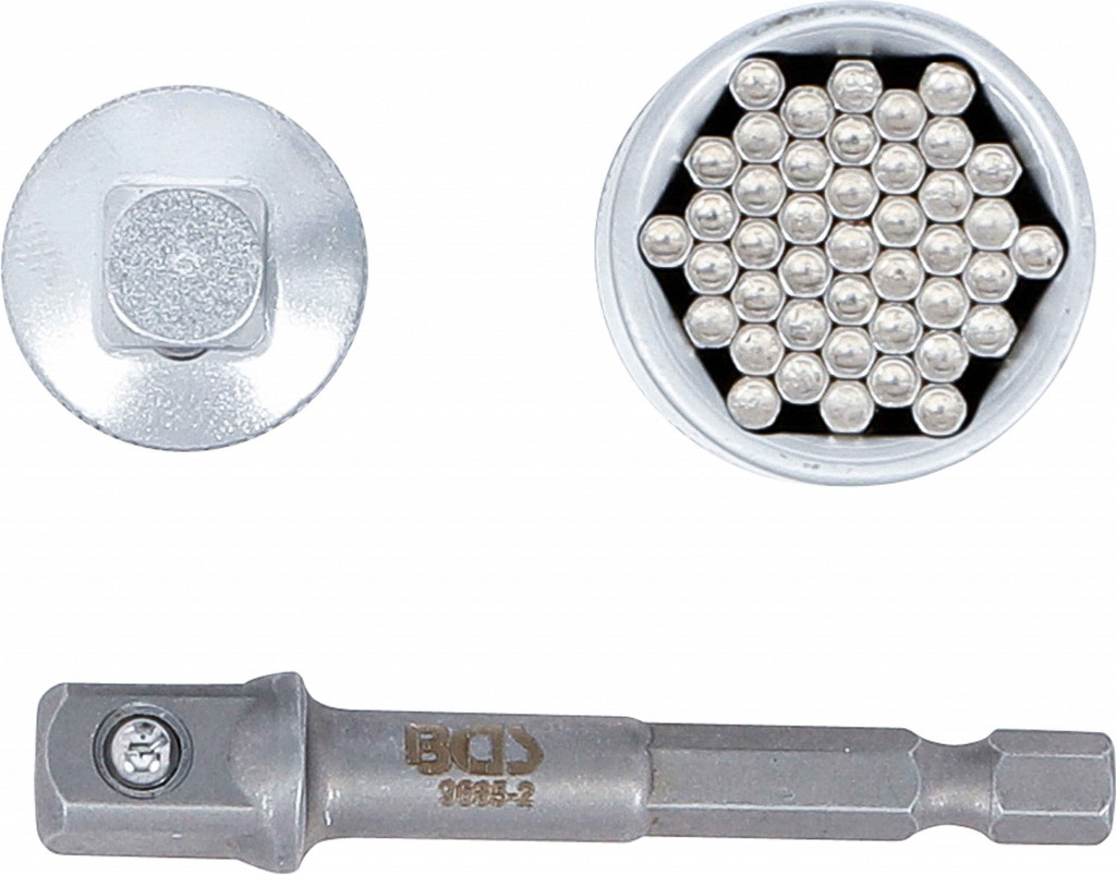 Primerno za vse šesterokotne vijake in matice, v palčnih in metričnih velikostihni primerno za uporabo na platiščih / kolesnih ključavnicah.obseg dobave:... 1 večnamenska vtičnica | 10 mm (3/8") pogon | 9–21 mm (BGS 2533)1 vtičnica | notranji kvadrat 12,5 mm (1/2") - zunanji kvadrat 10 mm (3/8") (BGS 270)1 adapter za električni vrtalnik | 6,3 mm (1/4") pogon / 10 mm (3/8") (BGS 9685-2)