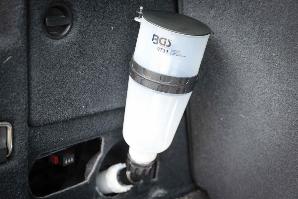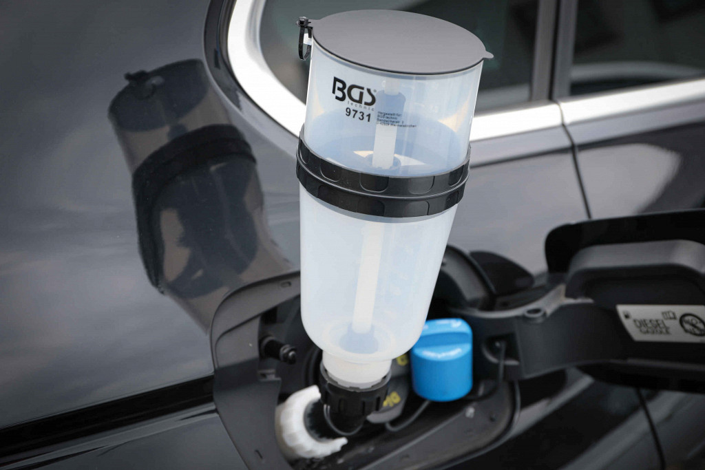 Posoda za polnjenje sečnine AdBlue® (AUS 32), ukrivljena izvedba. Vsebina: plastični pokrov proti prahu in umazaniji, ventil za zaporo ob polnem rezervoarju, vtisnjen merilnik nivoja na prozorni posodi, nekapljajoča izvedba.