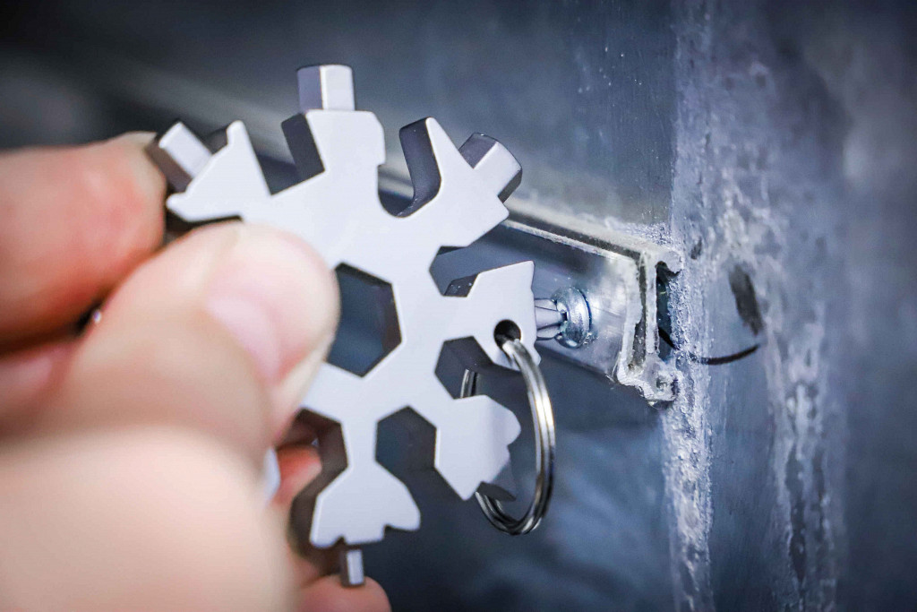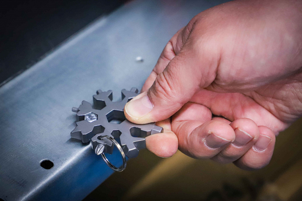 Edinstveno večnamensko orodje v oblikovanju snežinkemajhno in priročno hitro in priročno shranjeno v katerem koli žepu ali nahrbtniknepogrešljivo orodje doma ali na cestivsebuje 18 vrst funkcionalnih orodij, kot so odpirač za steklenice, izvijač s križnimi režami, ključ tipa L, izvijač z režami, odpirač za pločevinke itd. dolga življenjska dobazlomljeni robovi omogočajo, da orodje idealno leži na dlani in preprečuje poškodbez obeskom za ključe in kratko verigo za pritrditev na obroč, oči ali karabiner, primeren tudi kot unikatno "gospodsko darilo". Površinska obdelava: peskanje