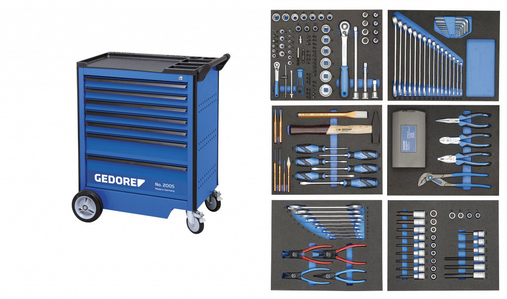 Voziček za s 7 predali. Dimenzije: v 985 x š 775 x g 475 mm. Centralno zaklepanje s cilindrično ključavnico. Široki predali (Š 640 x G 400 mm), s polnim izvlekom, možnost odstranitve. Vsak predal ima varnostno zaporo, enoročno rokovanje. Nosilnost predala 40 kg, spodnji predal je izdelan za večjo obremenitev 60 kg. Skupna nosilnost 500 kg. Komplet orodja v CT-penastih modulih, 190-delni. Orodja v metričnih dimenzijah. Sistem Check-Tool GEDORE: Preverjanje glede popolnosti na podlagi 2-barvnih penastih podlog.