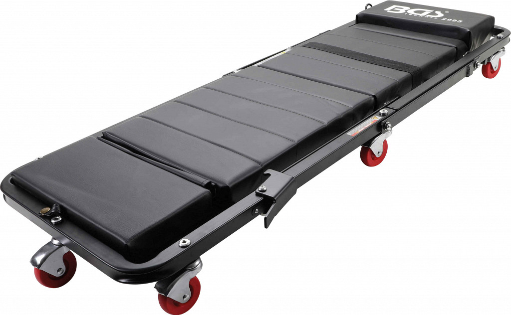 Z dvojnimi kolesnimi ležaji. Sintetično usnje, oblazinjen pokrov. Enostavno se spremeni iz ležalnika v sedež in obratno, nastavljiv. Površina za ležanje: 1060 x 310 mm (z vzglavnikom). Višina ležanja: 120 mm. Vzglavnik: 160 x 310 mm. Skupna velikost: 1200 x 420 x 120 mm. Največja nosilnost kot ležalnik 150 kg, kot sedež 130 kg. Material koles: polipropilen (PP).