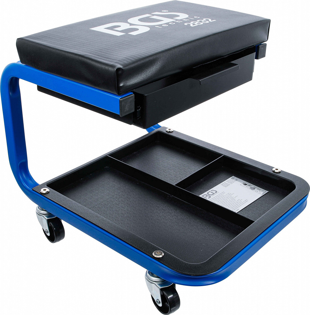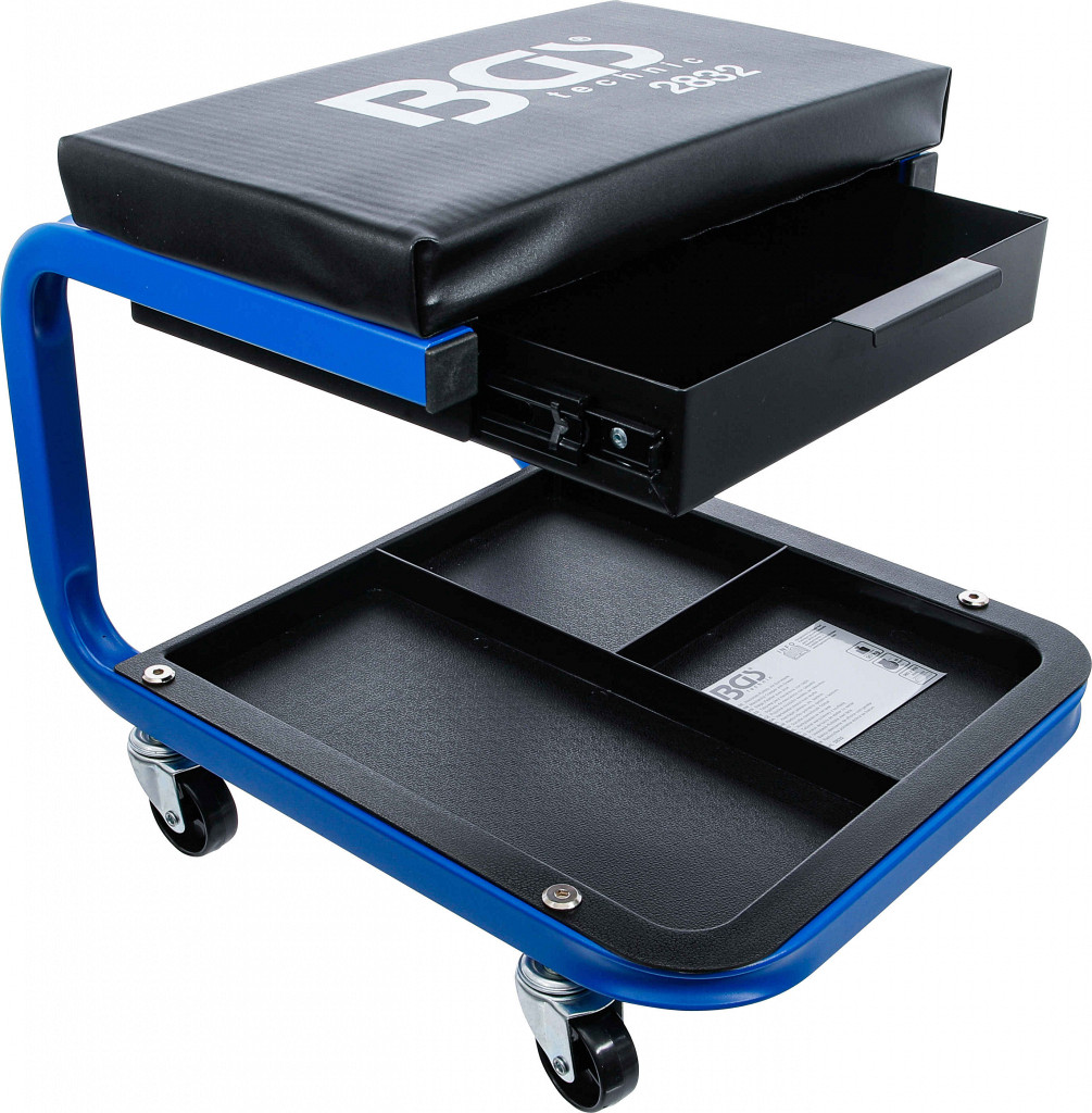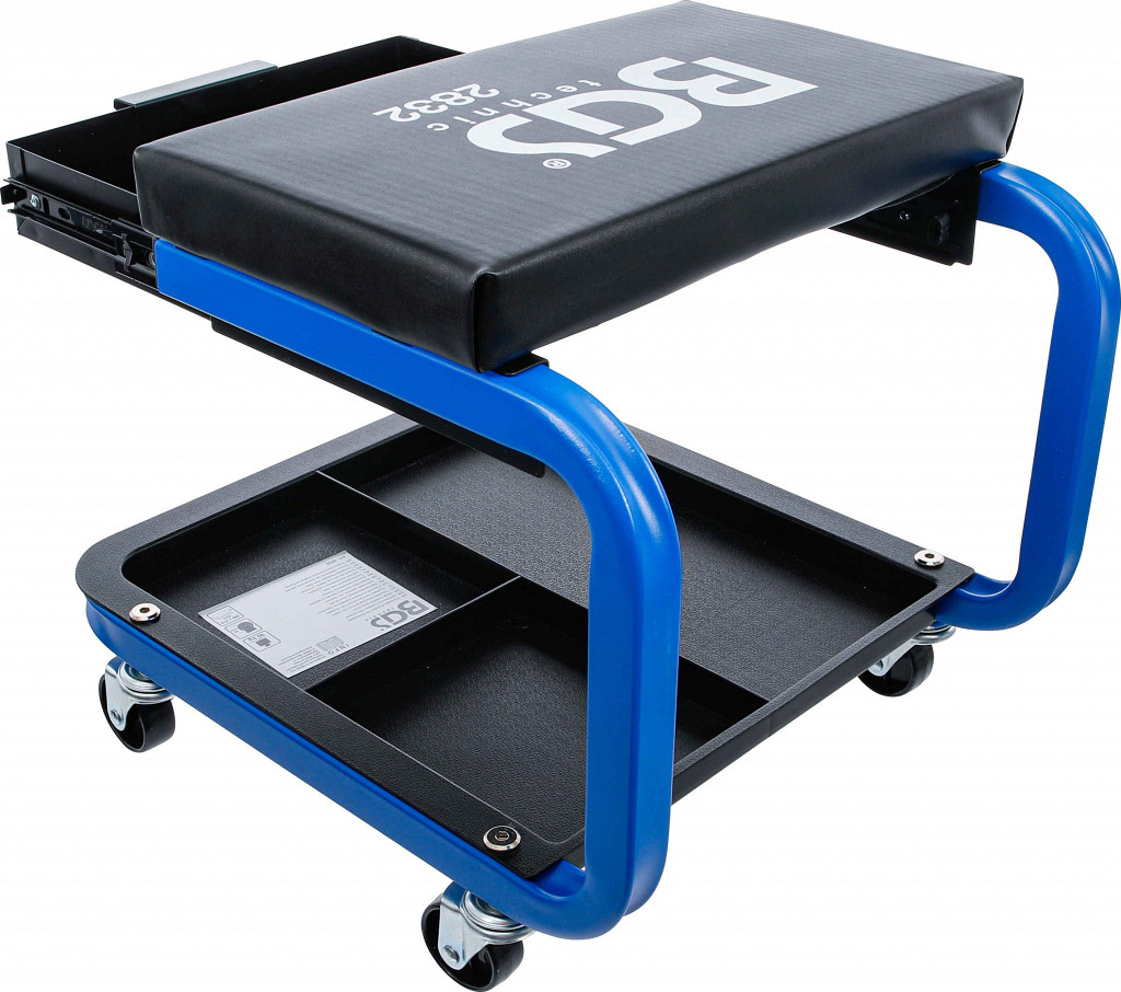 Stabilen jeklen okvir iz cevi (25 x 25 mm) s štirimi kolesi premera 50 mm. Velikost sedeža je 360 mm širine in 210 mm globine. Notranje mere predala so 275 x 205 x 50 mm. Dimenzije so 360 x 410 x 350 mm. Največja nosilnost je 90 kg.