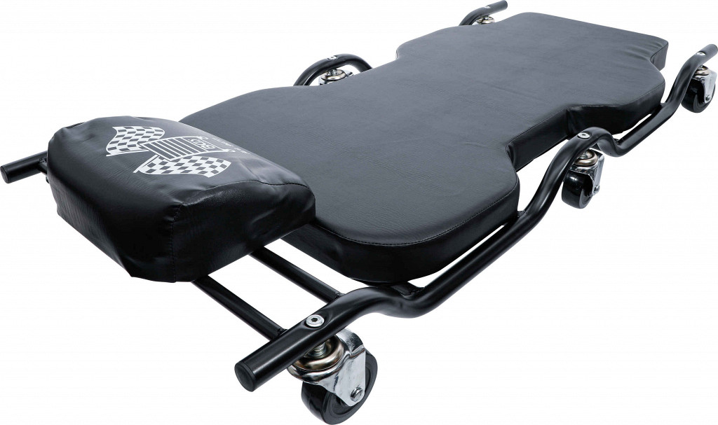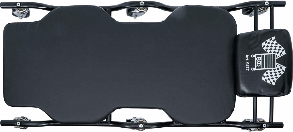 Ležalnik za udobno delo pod vozilom z oblazinjeno površino in vzglavnikom. Pralno oblazinjenje, nizka skupna višina, stabilna konstrukcija iz okroglih cevi, plastična vrtljiva kolesa z ležaji. Dimenzije 1135 x 510 x 185 mm, 6 koles.