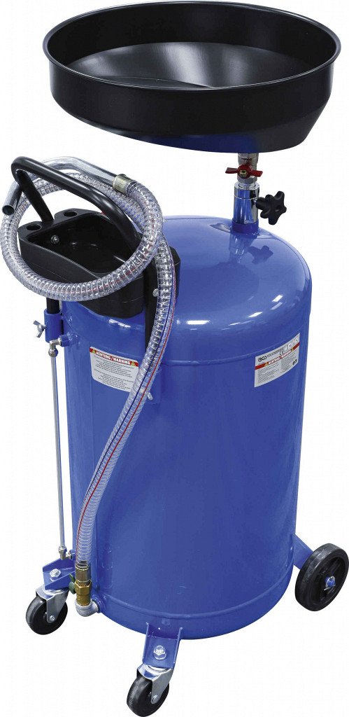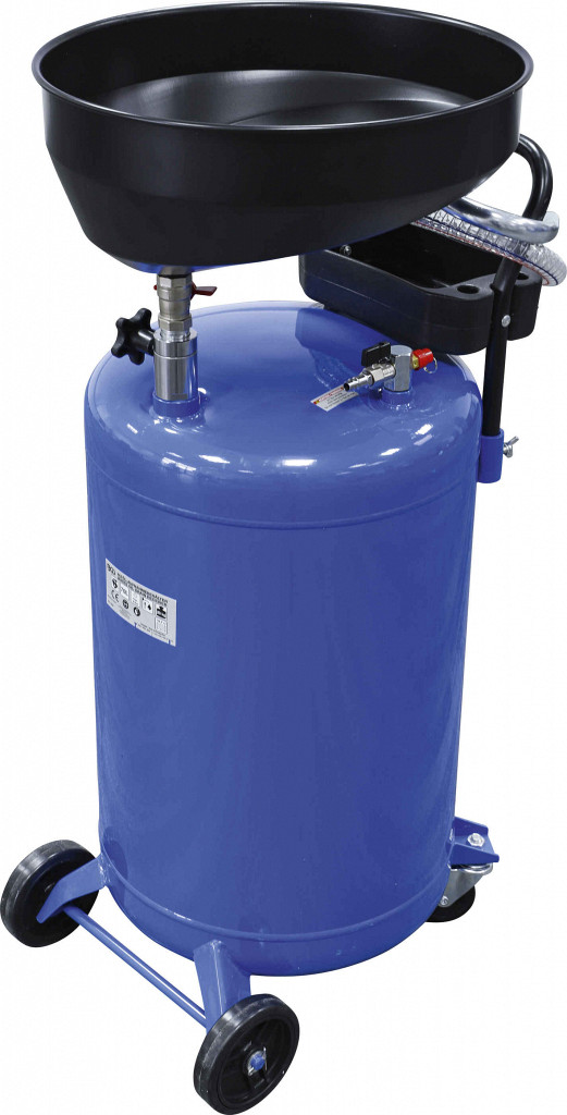 Mobilna zbiralna posoda za olje s prozornim kazalnikom nivoja, nastavljivo višino lijaka (100–160 cm), varnostnim ventilom in pnevmatskim praznjenjem. Prostornina zbiralnika 380 mm, lijak do Ø 420 mm.
