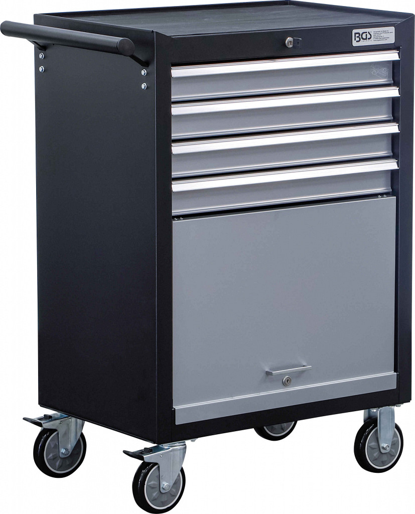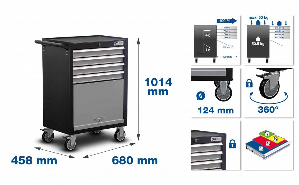 Robustna delavniška izvedba s pločevinastim ohišjem, prašno lakirano odporno na praske, kolesa s krogličnimi ležaji in 2 zavornima vrtljivima kolesoma, stranski ročaj za manevriranje, zaklepanje s centralno ključavnico, neprekinjeni ročaji, 4 gladko tekoči predali s kapaciteto 20 kg, preklopni predal do 50 kg, zgornja plošča z gumijasto prevleko do 50 kg, notranje mere predalov širina 565.8 mm, globina 399 mm, višina 55.8 mm, preklopni predal 565.8 x 399 x 345 mm, debelina sten ohišja 0.9 mm, predalov 0.7 mm.