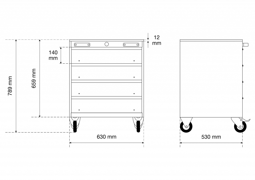 Število predalov: 4 Kos Širina: 630 mm; Višina: 789 mm; Dolžina: 530 mm; Površinska obdelava: prašno lakirana; Izvlek predala: 100 %; Širina predala: 590 mm; Višina predala: 4 x 140 mm; Globina predala: 420 mm
