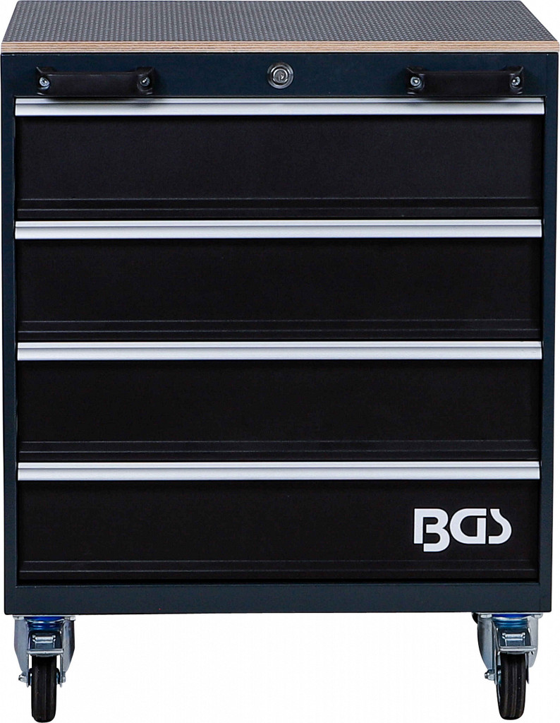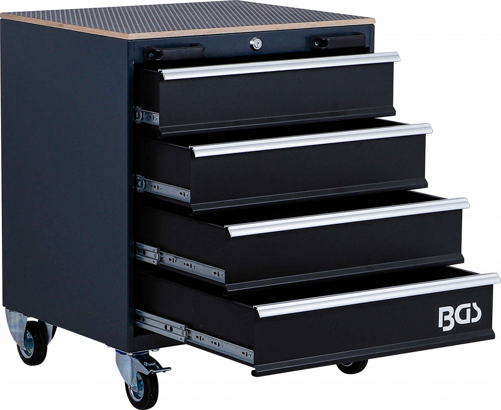 Za postavitev servisne delavnice, v tovarnah in podjetjih ali lastni garažni delavnici na domumodularni sistem za shranjevanje stenskih enot kombinacija samonosilna konstrukcija, ni potrebna dodatna pritrditev delavnicestabilna konstrukcija iz jeklene pločevine ohišje s prašnim premazom, še posebej odporna na prasketežka kolesa s krogličnimi ležaji, vključno z 2 vrtljivima kolesom, ki se lahko zaklenejo, ki se lahko zaklenejo s centralno ključavnico, neprekinjeni ročajni trakovipredali s samozapiralnim sistemom4 gladki predali s krogličnimi ležaji: Kapaciteta od 1. do 4. predala do 30 kg (vsak predal).prilagojena postavitev lastne delavniške opreme, s kombinacijo z drugimi elementiidealnimi za individualno oblikovanje delavnice.. širina predala (notranja dimenzija): 567 mm globina predala (notranja dimenzija): 418 mm višina predala (notranja dimenzija): 4 x 118 mmdebelina stene telesa: 0,8 - 1,2 mmdebelina stene predali: 0,8 - 1,2 mm.obseg dobave:. 1 voziček za orodje, s 4 gladkimi predali s krogličnimi ležaji, nosilnost do 30 kg (vsak predal)2 ključa. kombinirati z BGS 80200 - 80203, 80218 in 80219