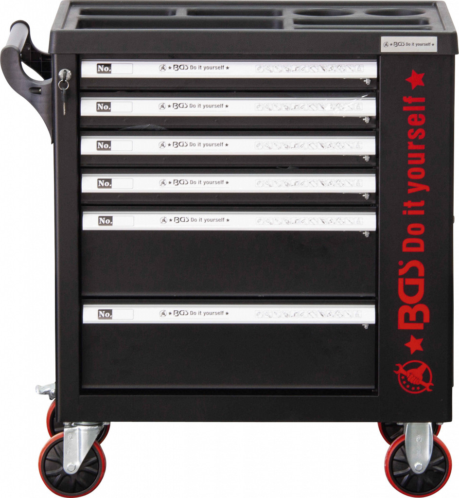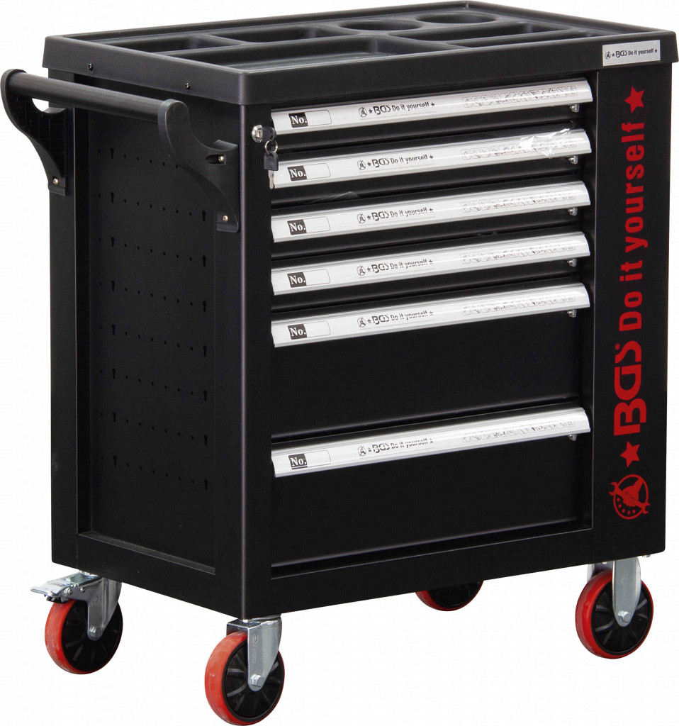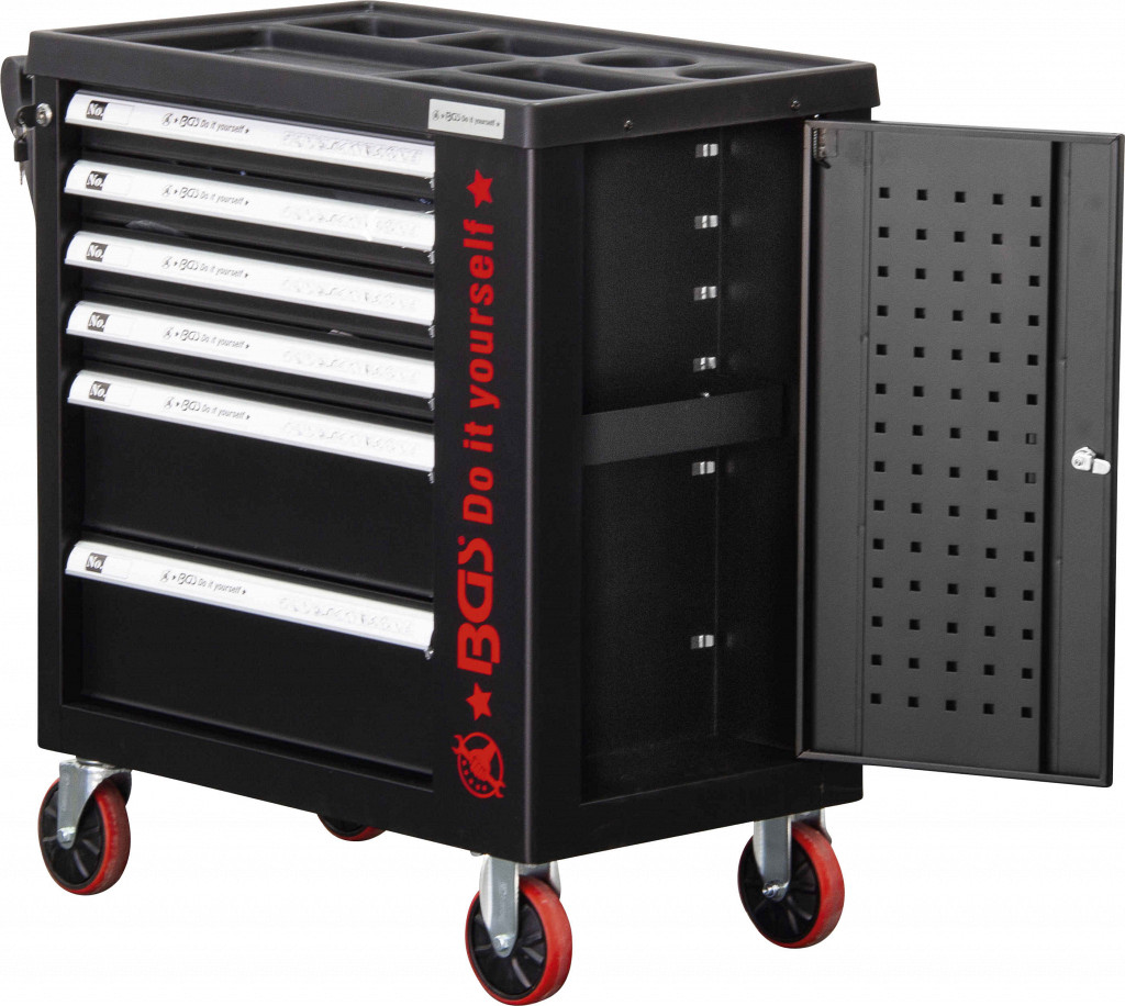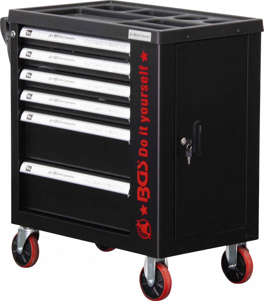 Voziček z 4 kolesi z ležaji Ø 120 mm, od tega 2 z zavoro, vsaka predala posebej zaklenjena z varnostno ključavnico, z ločenim omaricnim delom (globina 125 mm) in stranskimi vrati z lastno ključavnico. 6 predalov (4 x 20 kg, 2 x 30 kg), notranja širina 505 mm, globina 400 mm, višina 4 x 53 mm, 2 x 155 mm.
