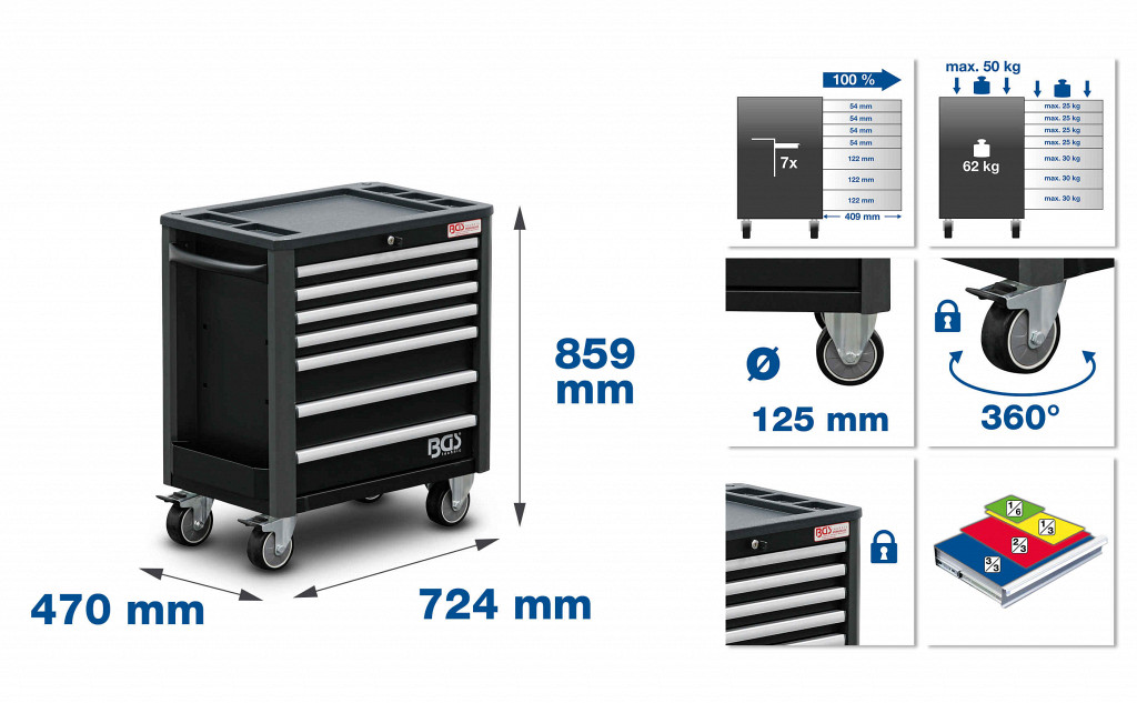 Robusten voziček; stene 1,2 mm, predali 0,8 mm; višina 85,9 cm; kolesa Ø 125 mm z ležaji, 2 z zavoro; centralno zaklepanje; 7 predalov: 1.–4. po 25 kg, 5.–7. po 30 kg; varnostna zapora; zgornja plošča s 5 predelki; stranski predal 78 x 370 x 75 mm; stranski ročaj.