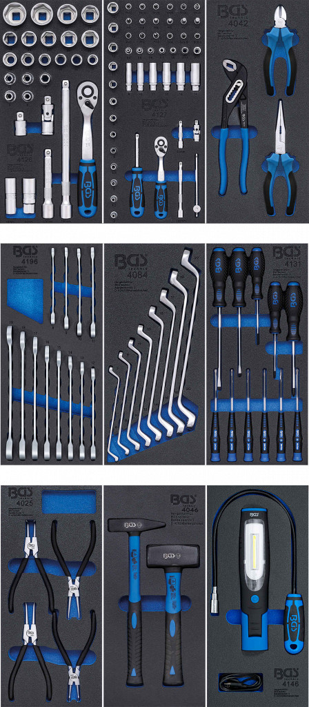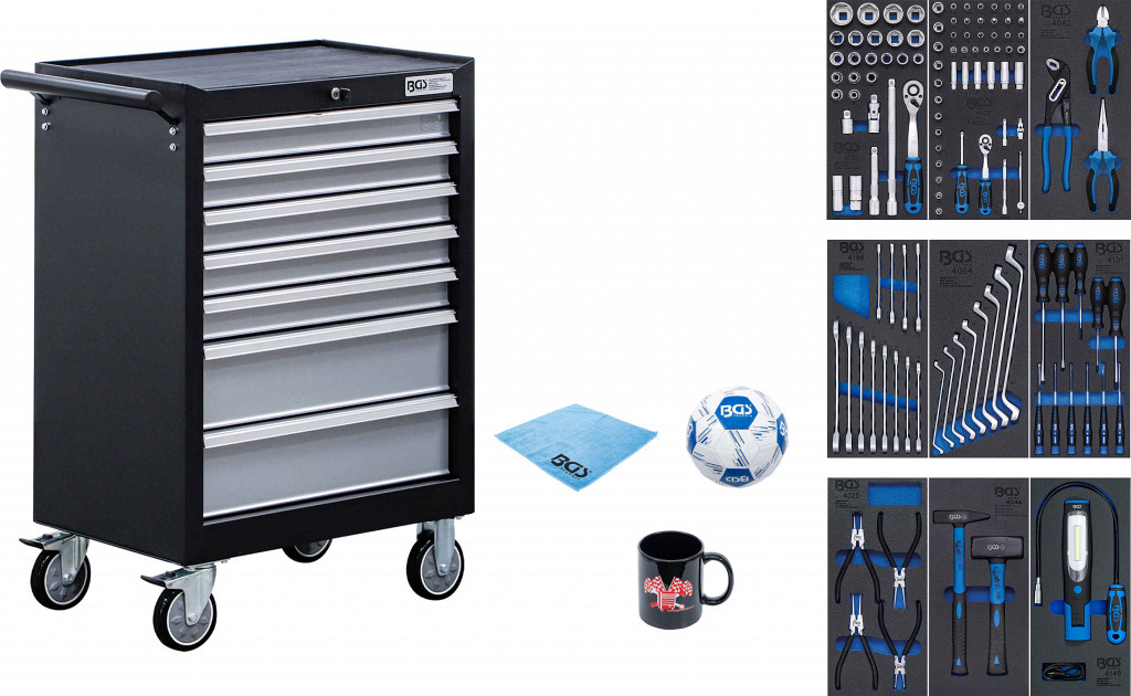 Robustna delavniška izvedba z 9 vložki za orodje 1/3 iz trpežne pene (189 x 408 x 32 mm), stabilna pločevinasta konstrukcija, prašno lakirano ohišje odporno na praske, kolesa s krogličnimi ležaji in 2 zavornima vrtljivima kolesoma, stranski ročaj za enostavno manevriranje, zaklepanje s centralno ključavnico, neprekinjeni ročaji, 7 gladko tekočih predalov s kapaciteto 20 kg v prvih petih in 25 kg v zadnjih dveh, zgornja plošča z gumijasto prevleko do 50 kg, notranje mere predalov širina 565.8 mm, globina 398 mm, višina 5 x 56.5 mm in 2 x 135.5 mm, debelina sten ohišja 0.9 mm, predalov 0.7 mm, obseg dobave: voziček z 7 predali prazen, vložek nasadnih ključev 1/2" 27 delov, vložek nasadnih ključev 1/4" 50 delov, vložek klešč 3 deli, vložek obročnih ključev z globokim zamikom 8 delov, vložek izvijačev 11 delov, vložek seger klešč 4 deli, vložek kamenja in kladiv 2 dela, vložek raglja kombiniranih ključev 12 delov, vložek ročne svetilke in magnetnega dvigala 3 deli, BGS nogometna žoga, mikrovlaknena krpa 400 x 400 mm, BGS skodelica.