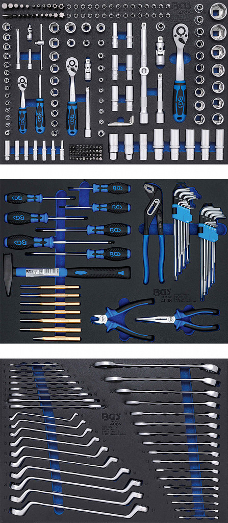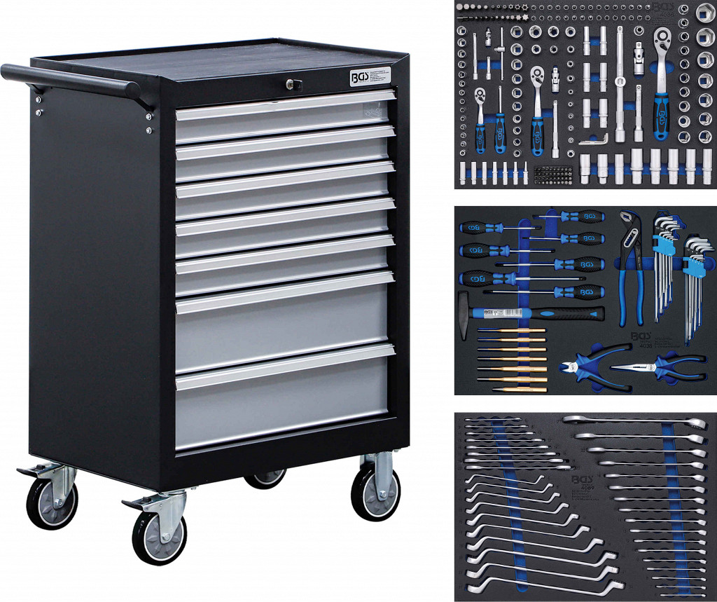 Robustna delavniška izvedba s 3 vložki za orodje 3/3 iz trpežne pene (567 x 408 x 32 mm), stabilna pločevinasta konstrukcija, prašno lakirano ohišje odporno na praske, kolesa s krogličnimi ležaji in 2 zavornima vrtljivima kolesoma, stranski ročaj za enostavno manevriranje, zaklepanje s centralno ključavnico, neprekinjeni ročaji, 7 gladko tekočih predalov s kapaciteto 20 kg v prvih petih in 25 kg v zadnjih dveh, zgornja plošča z gumijasto prevleko do 50 kg, notranje mere predalov širina 565.8 mm, globina 398 mm, višina 5 x 56.5 mm in 2 x 135.5 mm, debelina sten ohišja 0.9 mm, predalov 0.7 mm, obseg dobave: voziček z 7 predali prazen, vložek nasadnih ključev 192 delov, vložek kladivo klešče in izvijači 36 delov, vložek viličasti, obročni in kombinirani ključi 35 delov.