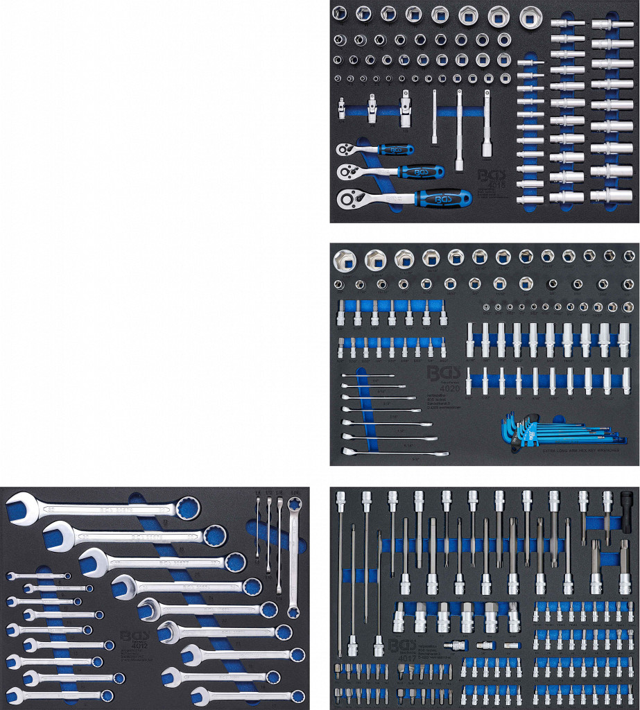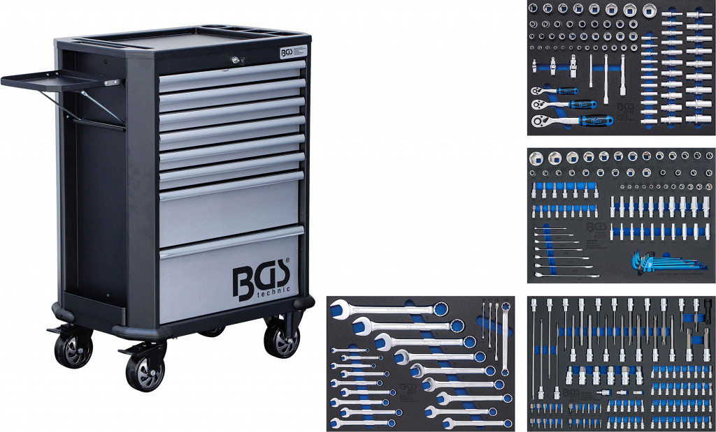 Masivna delavniška izvedba, stabilna konstrukcija iz jeklene pločevine, ohišje prašno lakirano in odporno proti praskam, kolesa z ležaji, 2 vrtljivi zavorni kolesi, stranski ročaj za enostavno manevriranje, centralna ključavnica, nastavljiva stranska polica 254 x 275 mm, zaščita robov, 8 predalov z nosilnostjo 20 kg (1.–6.) in 25 kg (7.–8.), zgornja plastična polica z nosilnostjo 50 kg, zaprta zgornja delovna površina proti iztekanju tekočin, notranje mere predalov: širina 560,4 mm, globina 407,8 mm, višina 6 x 41,3 mm | 1 x 154,8 mm | 1 x 212,8 mm, debelina sten ohišja 1,2 mm, predali 0,8 mm, obseg dobave: voziček z 8 predali, vložek 3/3 kombinirani ključi in E-ključi 22 kosov, vložek 3/3 nasadni set 80 kosov, vložek 3/3 colski ključi in nasadni ključi 90 kosov, vložek 3/3 nastavki in bit nastavki 104 kosi