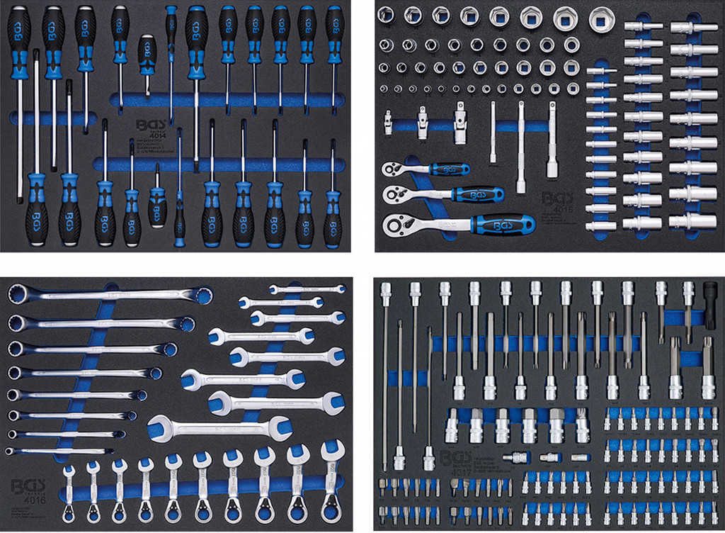 Delavniški voziček z 8 predali, izdelan iz stabilne jeklene pločevine s prašno lakiranim ohišjem, odporno na praske. Opremljen je z osmimi gladko drsečimi predali na krogličnih vodilih (1.–6. nosilnost do 20 kg, 7.–8. nosilnost do 25 kg), stabilno plastično odlagalno ploščo s petimi predelki (nosilnost do 50 kg), zatesnjeno zgornjo delovno površino, nastavljivo stransko polico, zaščito robov, centralno ključavnico in kolesi na krogličnih ležajih z dvema vrtljivima zaklepnima kolesoma. Notranje mere predalov: širina 560,4 mm, globina 407,8 mm, višina 6 x 41,3 mm, 1 x 154,8 mm, 1 x 212,8 mm. Debelina sten ohišja 1,2 mm, predalov 0,8 mm. Vsebina dobave: voziček z vložki – komplet izvijačev z T-ročajem (18 kosov), klešče, set udarnih zatičev in kladivo (17 kosov), kombinirani in E-tip ključi (22 kosov), nasadni ključi z T-ročajem (9 kosov), komplet izvijačev (23 kosov), nasadni ključi (80 kosov), dvoglavi vilasti ključi, obročasti ključi in raglja (26 kosov) ter set nastavkov in nasadnih nastavkov (104 kosi).