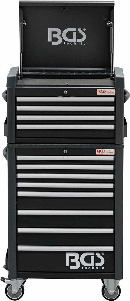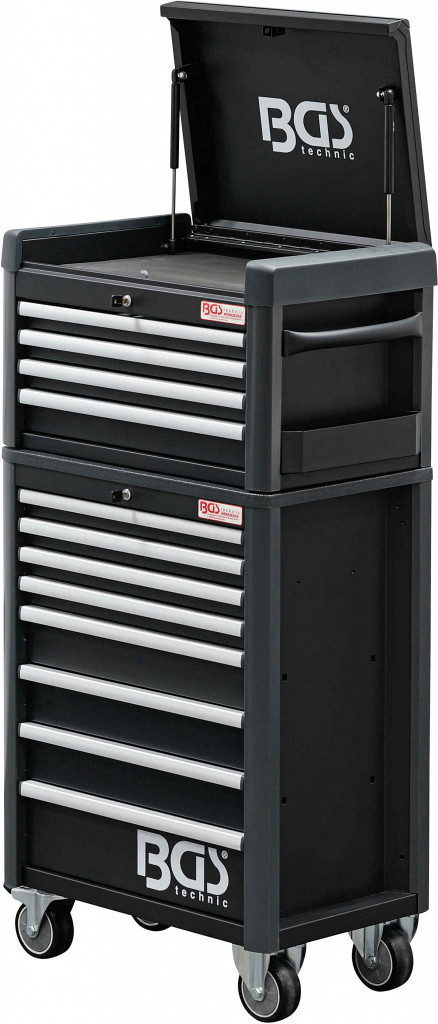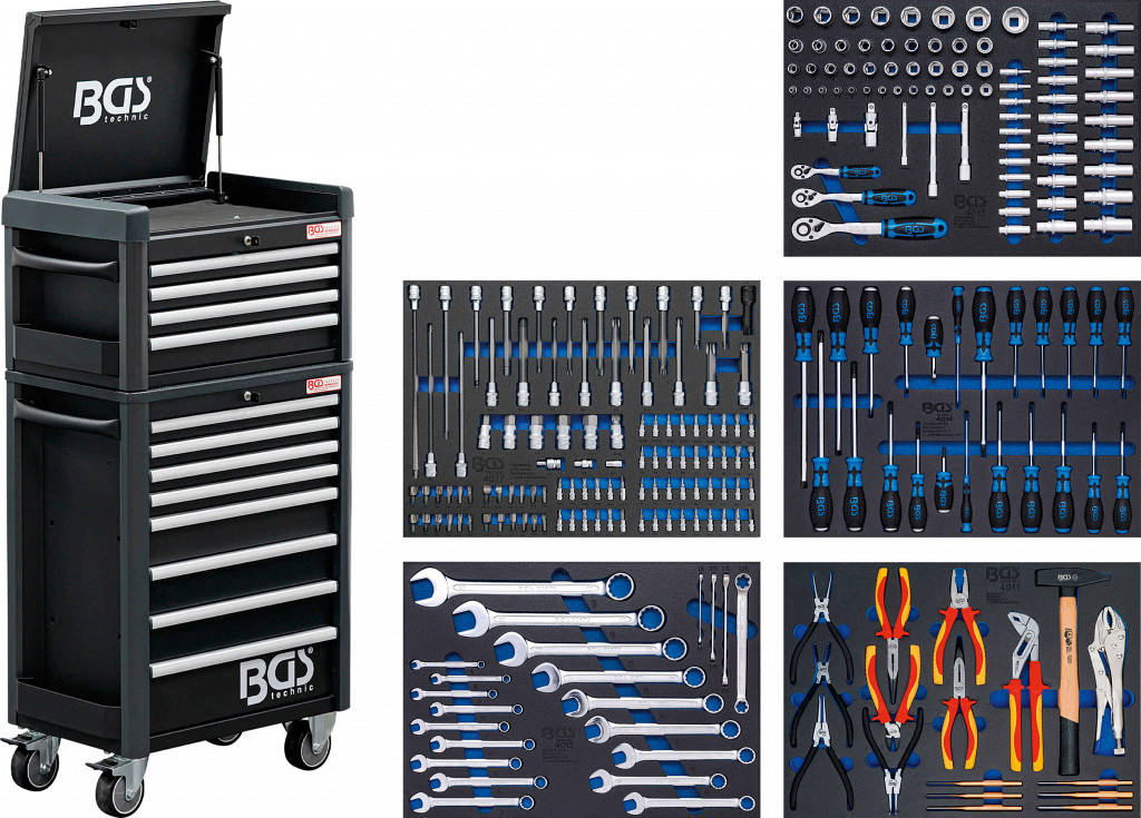 Delavniški voziček BGS 4111 + škatla BGS 4112; vključuje 5 vložkov (567 x 408 x 32 mm): klešče, zatiči, kladivo 17-delni (BGS 4011); viličasti in E-ključ set 22-delni (BGS 4012); izvijači 23-delni (BGS 4014); raglje in nasadni ključi 80-delni (BGS 4015); set bitov in nastavkov 104-delni (BGS 4017).