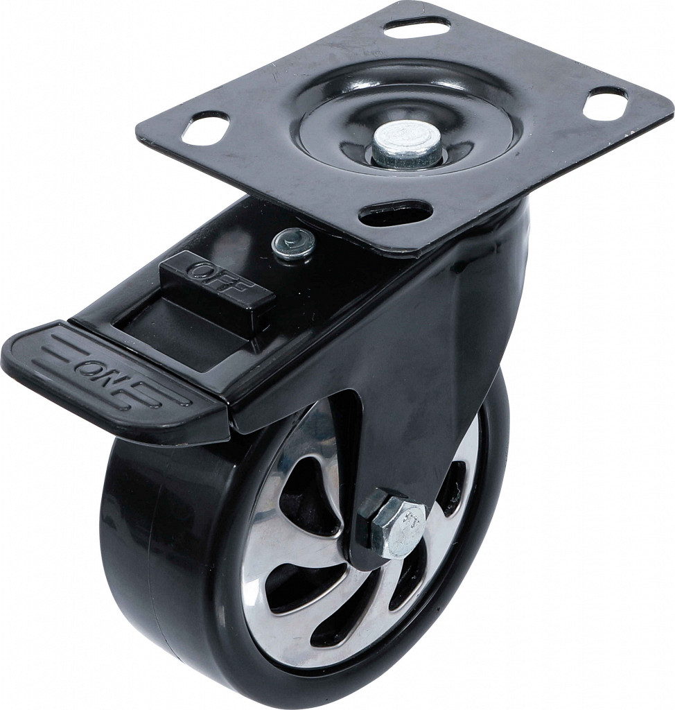 Primerno za vozičke za orodje BGS 4107, 4204, 4205, 4206, 4199, plastično kolo s krogličnimi ležaji in montažno ploščo, z nožno zavoro, širina montažne plošče 105 mm, dolžina montažne plošče 115 mm, debelina materiala plošče 2,6 mm, razmak lukenj krajša stran 70 mm, razmak lukenj daljša stran 85 mm, skupna višina 164 mm, širina kolesa 48 mm.