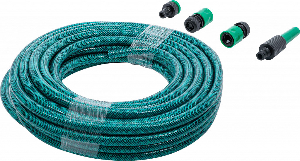 Robustna cev za vodo za uporabo v domu in na vrtuza zalivanje travnikov, rastlin, cvetja, sadilnikov, dreves ali grmičevjauporaben tudi v kmetijstvutrislojna konstrukcija cevi, zagotavlja odpornost na visok tlak in dolgo življenjsko dobotlačna tkanina s prečnim navojem iz poliestra, odpornega proti trganjupreprost vtični sistem omogoča hitro in enostavno povezavoneskončno nastavljiva intenzivnost razprševanja vode, nastavljiva od fine vodne megle do polnega curka z vrtljivim gibanjemzdružljiva z vsemi običajnimi namakalni sistemi .. razpokalni tlak: 18 debelina barwall: 2 mmnotranji premer cevi: 11,5 mmzunanji premer cevi: 15,5 mmmaterial 1: ABS plastika 2: PP plastika.obseg dobave:. 1 cev za vodo, 3-slojna, s tkanino s prečnim navojem | PVC | 15 m1 škropilnica za vodo, brezstopenj1 adapter za priključitev pipe za vodo, notranji navoj 3/4" (ženski), zunanji navoj 1/2" (moški)1 priključek za vodo s hitrim priključkom, notranji navoj 1/2"1 hitra priključka s hitrim priključkom 1/2"1 hitra priključka s hitrim priključkom 1/2"1 hitra priključka s hitrim priključkom in zaustavitvijo vode 1/2"